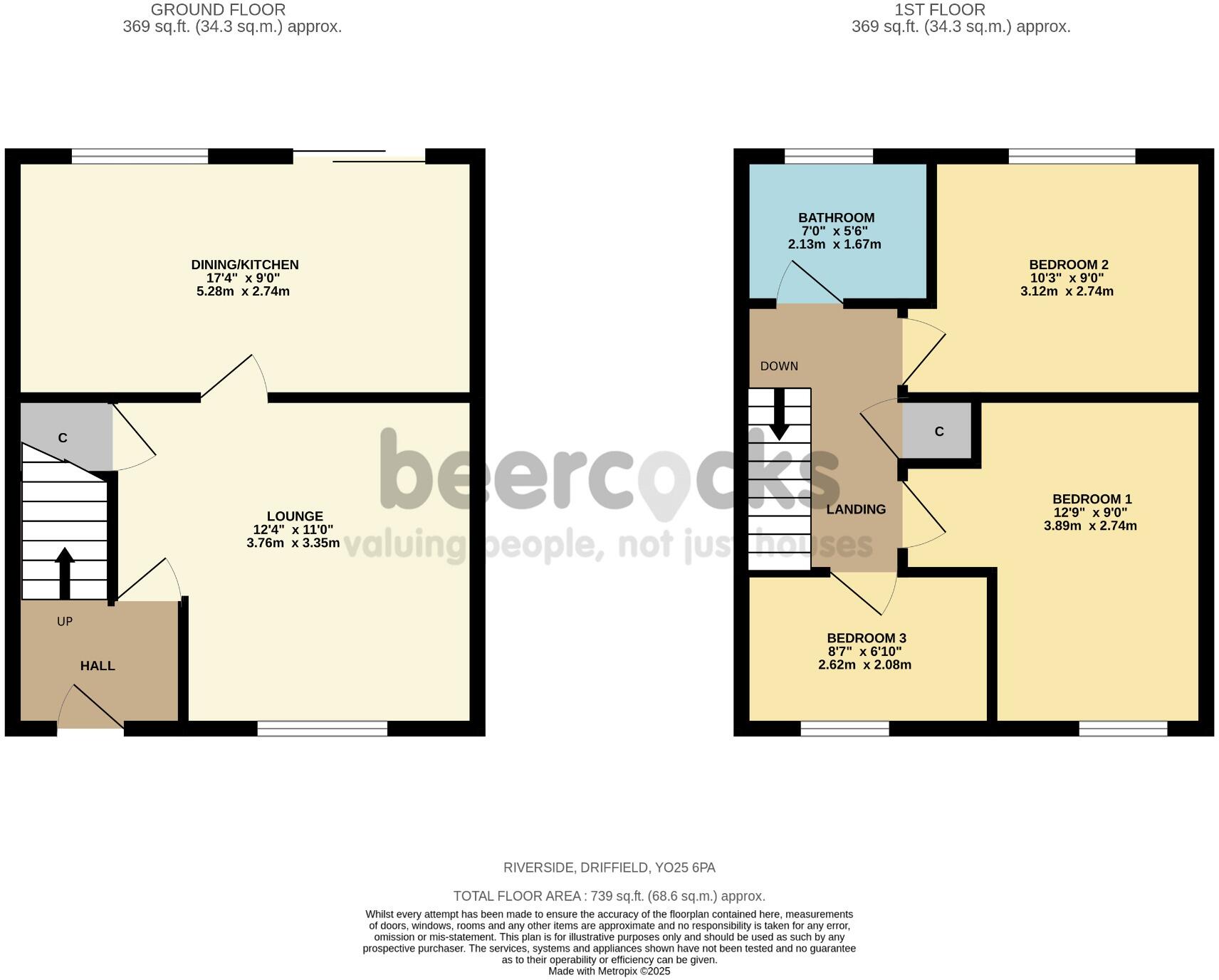 This property is a 3-bedroom semi-detached house located in Driffield, East Riding of Yorkshire. The location is pleasant, situated near a river and within reasonable proximity to local schools and transport links. The property itself appears well-maintained from the exterior photos, and the garden is a notable feature. The interior photos show a property that is habitable but could benefit from some modernisation to enhance its appeal and potentially increase its value. The list price of £185,000 is slightly below the average price for the area (£239,019), but given the smaller size (739 sq ft compared to the average of 937 sq ft) and the need for potential modernisation, the price appears relatively reasonable. Further analysis of comparable properties and a physical inspection would be beneficial for a more comprehensive evaluation.