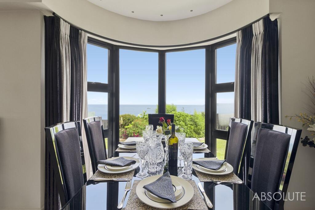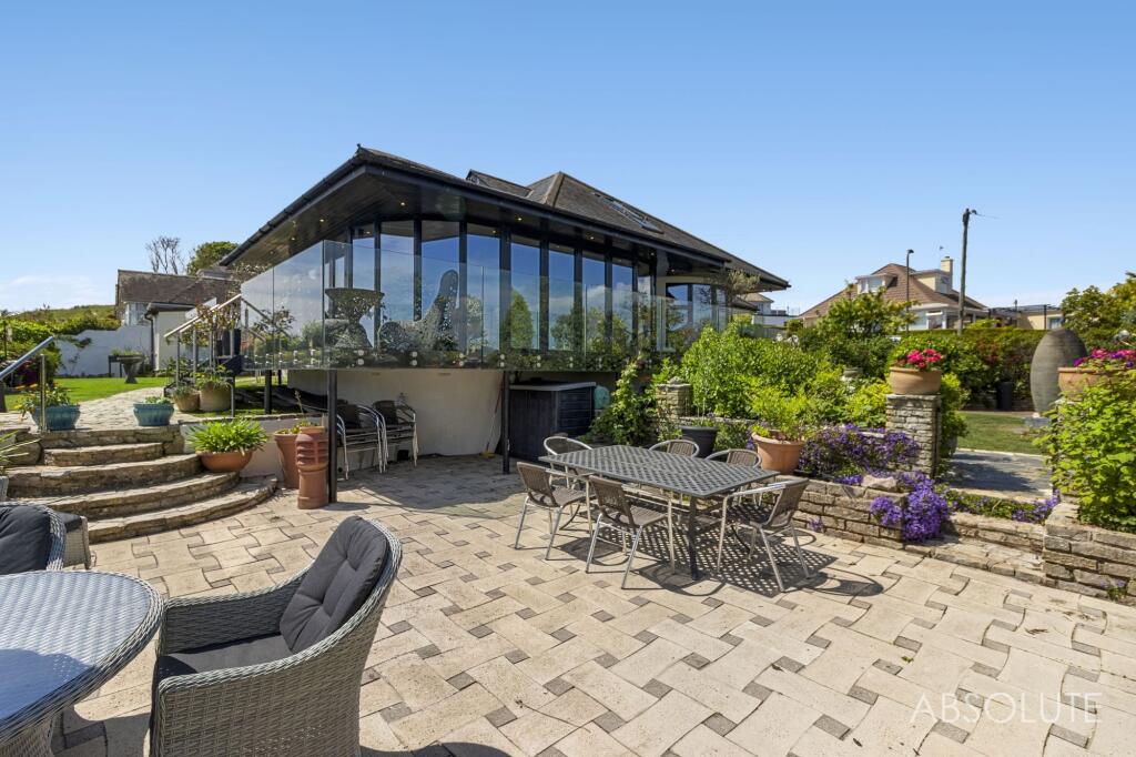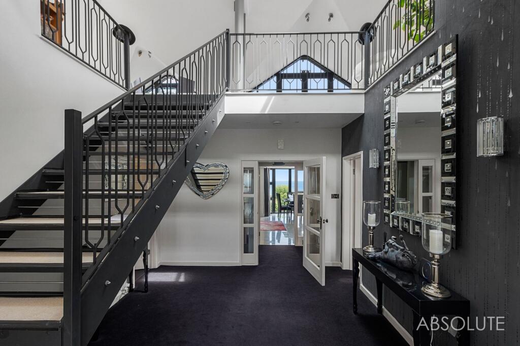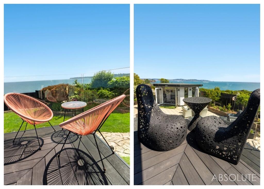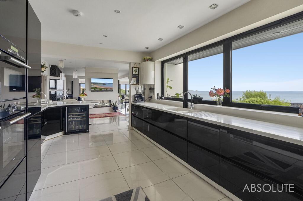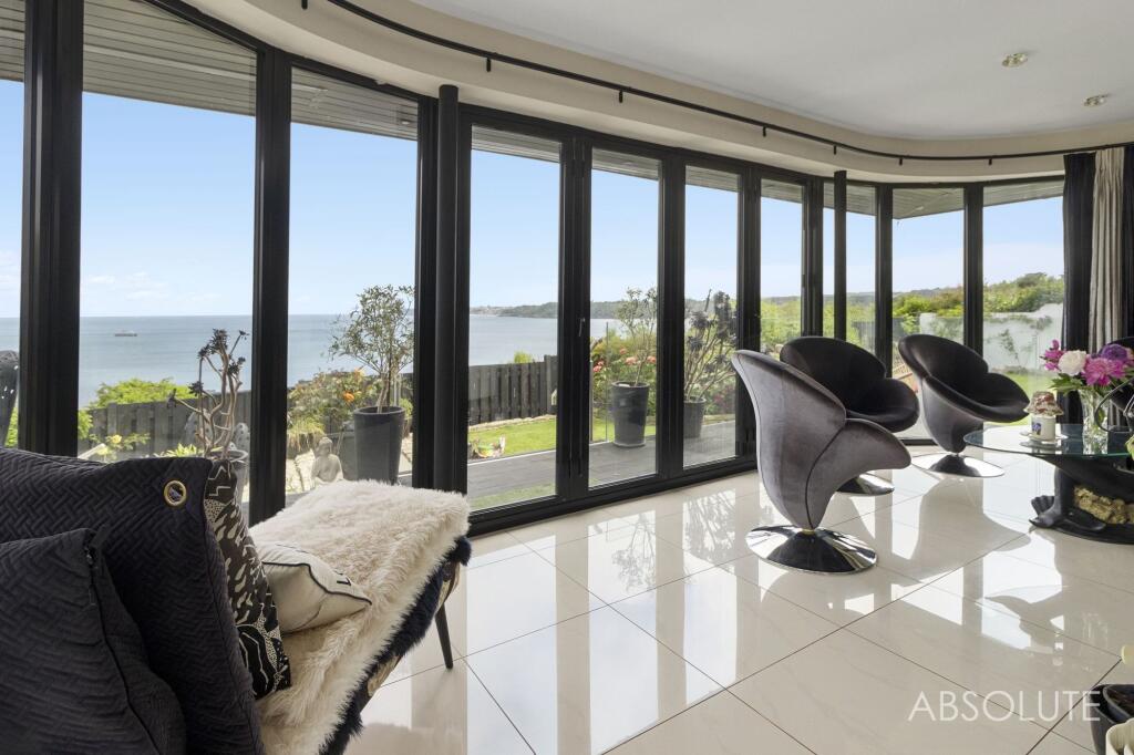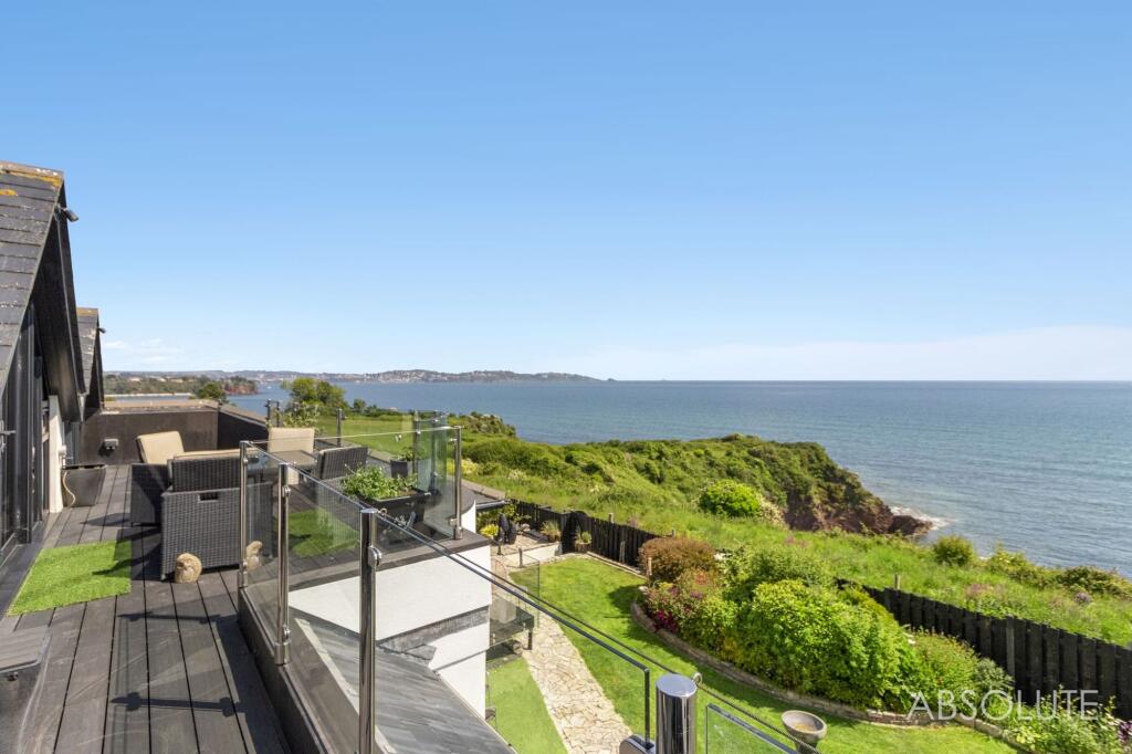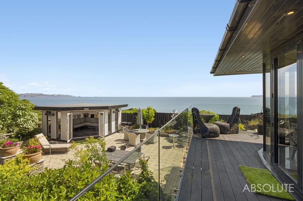 Bespoke 3-bed coastal house with panoramic sea views, contemporary design, spacious open plan living, luxury kitchen, indulgent master suite, potential for 4th bed, stunning first-floor extension, and 16m balcony. Beautiful gardens. Garage and parking.