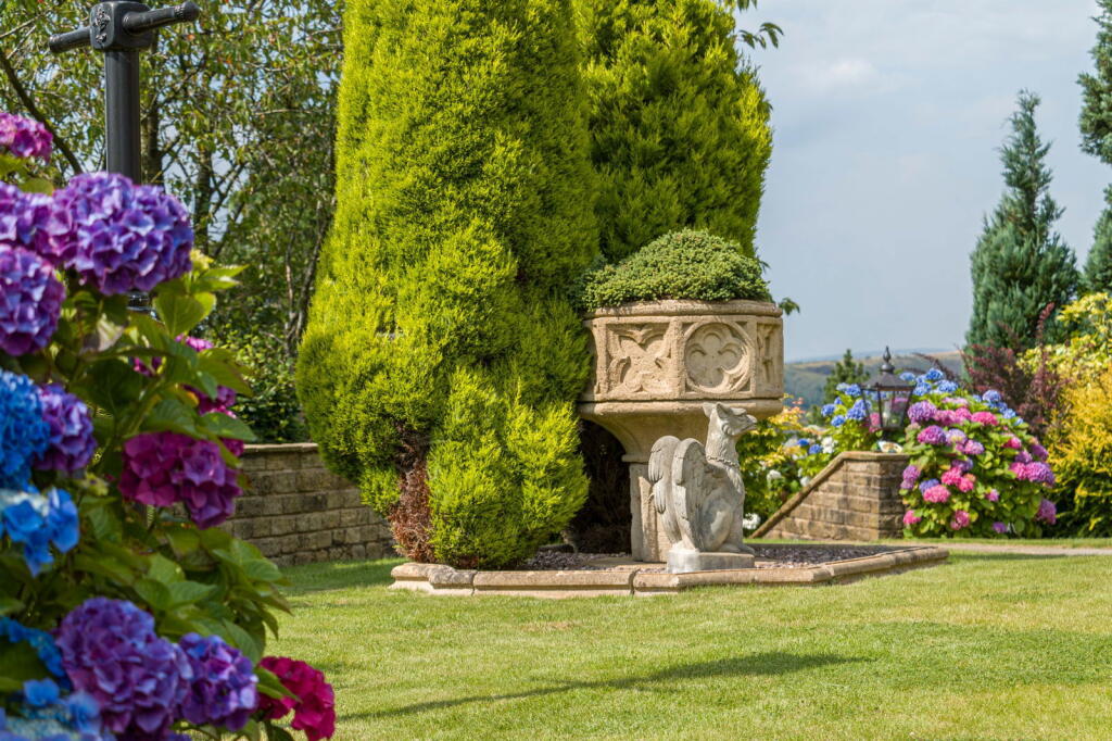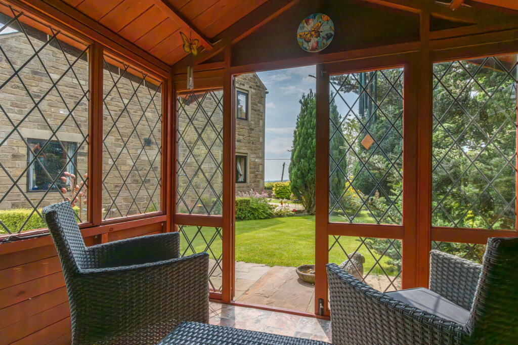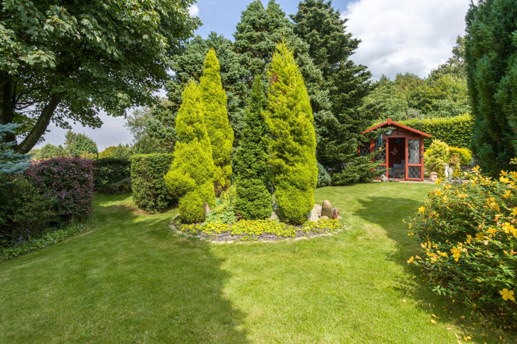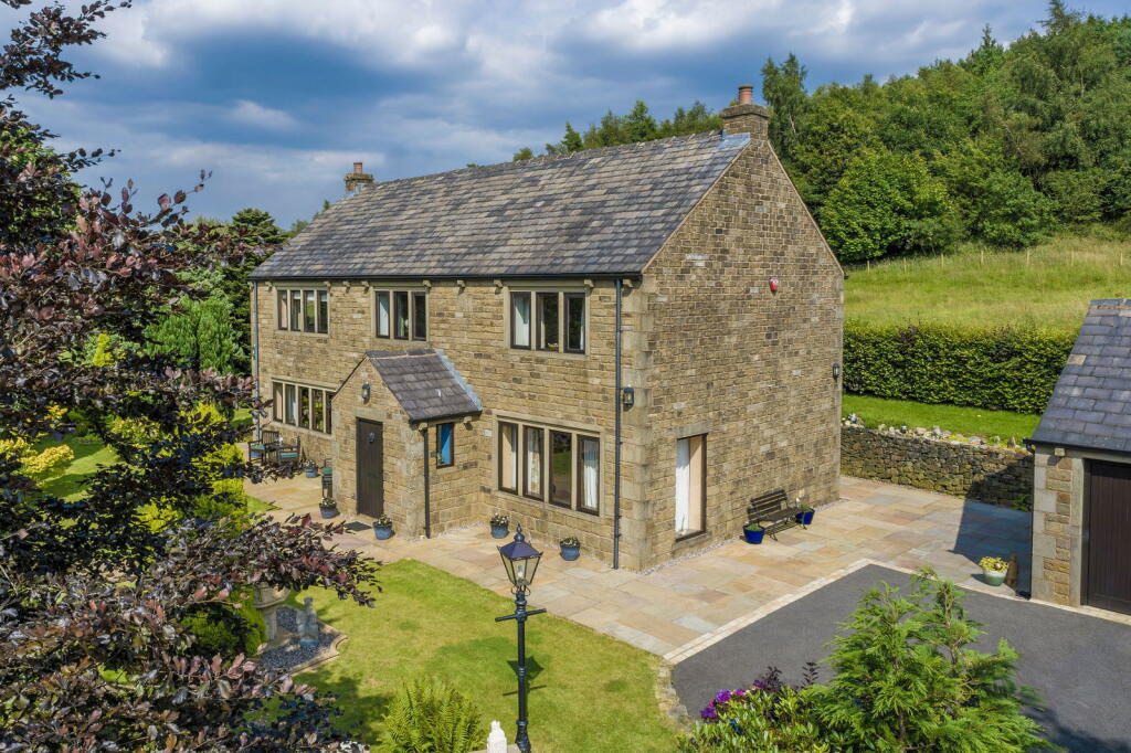 Sitting proudly above the Saddleworth village of Uppermill in a rural setting is ‘The Rowans’ built in 1999 in traditional style - a four bedroom detached family home which includes well balanced living accommodation throughout. Meticulously manicured gardens wrap around the home w...