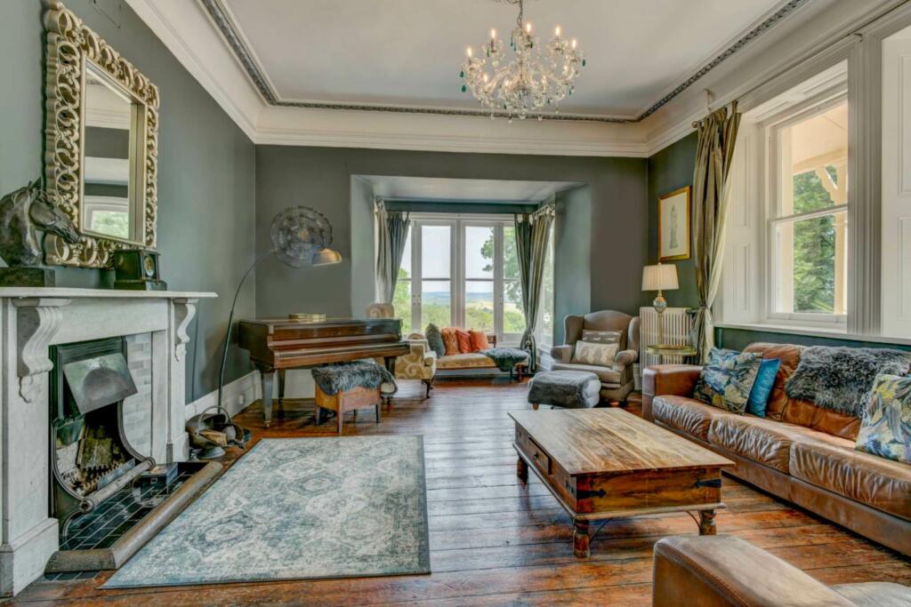 This property listing presents a substantial country house with multiple buildings and extensive land in North Devon. The manor house boasts nine bedrooms and seven bathrooms, indicating a large scale property. Accompanying the main house are a separate three-bedroom lodge, three holiday cottages, and nine luxury woodland cabins, suggesting a potential for diverse uses such as a large family home, multi-generational living, or a lucrative hospitality venture. The property features formal gardens, approximately 20 acres of ancient woodland, and a swimming pool. The interior design appears tasteful, blending period features with modern updates.