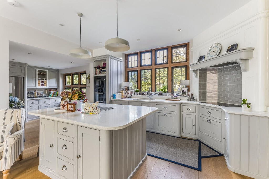 Park House is a substantial detached property located in the village of Thundridge, Hertfordshire. The house offers four bedrooms and three bathrooms, with a large garden. The property appears to be in good condition, with modern fixtures and fittings. The location offers a semi-rural lifestyle with good access to nearby towns and transport links. The property includes a garage, a patio, and a fireplace. The house blends modern updates with traditional features.