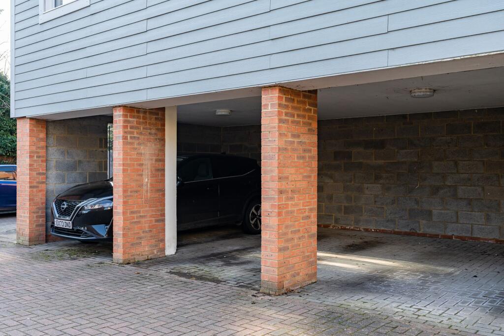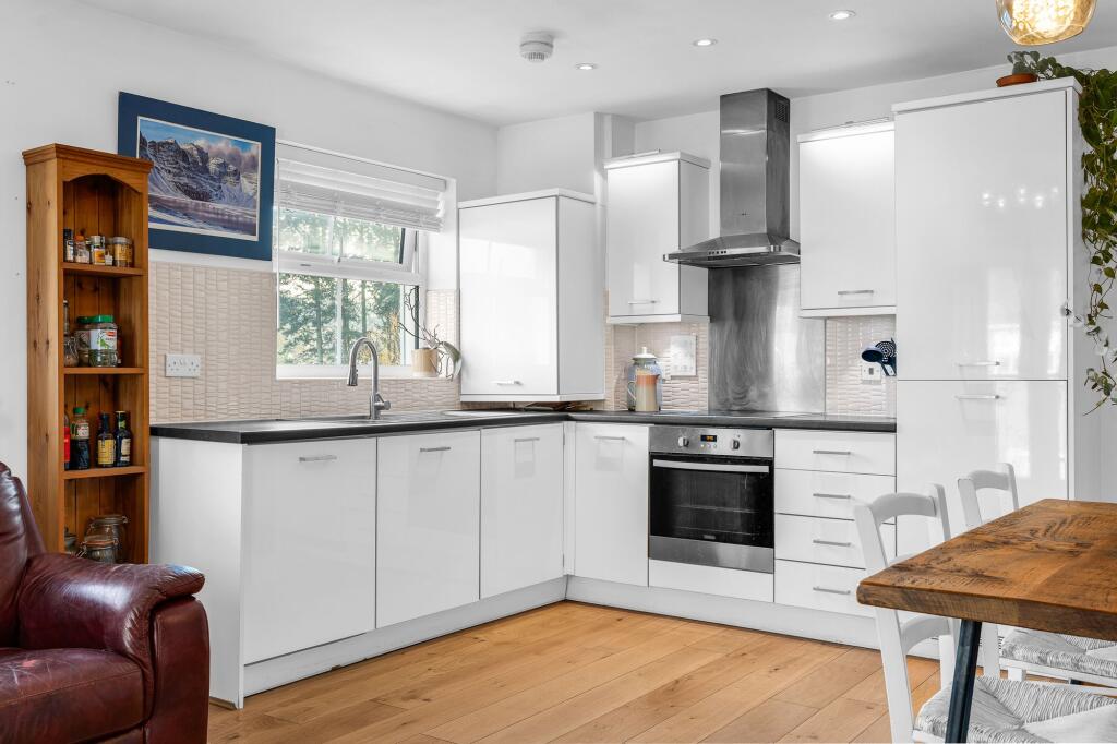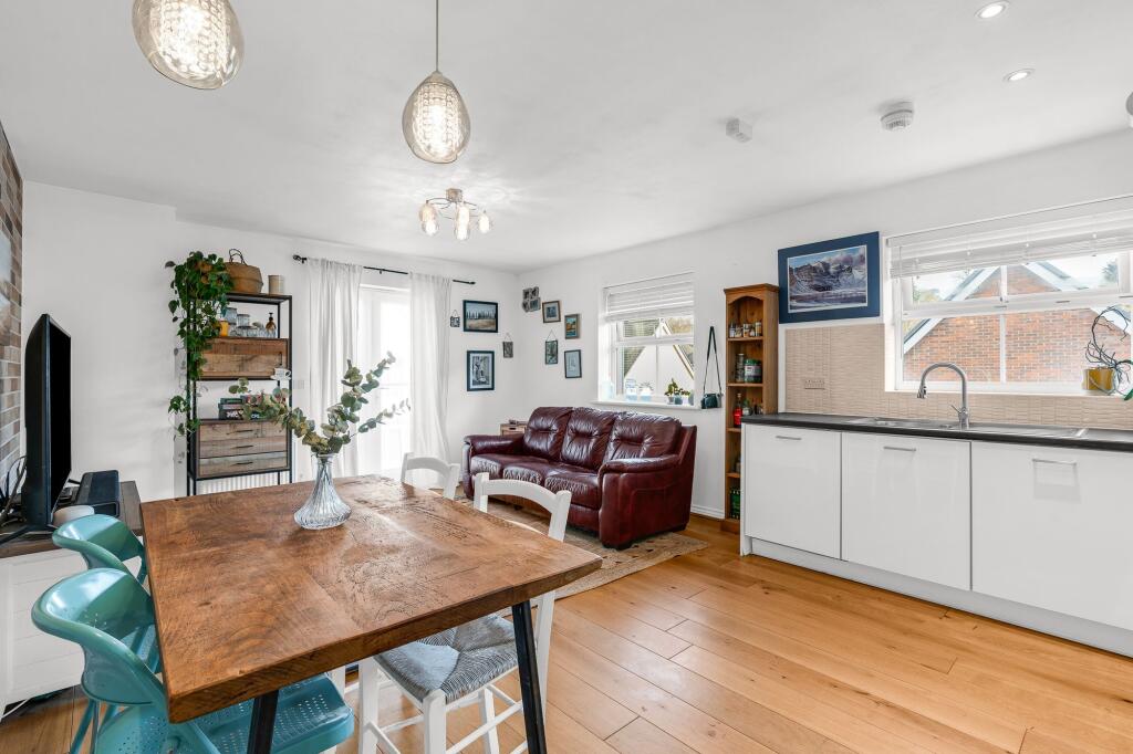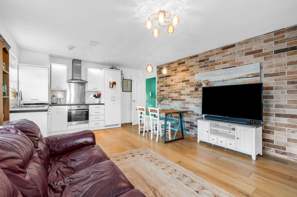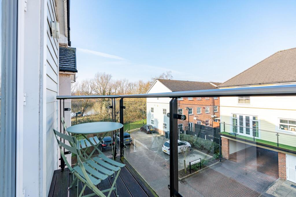 Top floor 2-bed apartment with open plan living/dining, balcony with river views, integrated kitchen, bathroom, communal gardens, double glazing, gas heating, carport, residents parking.
