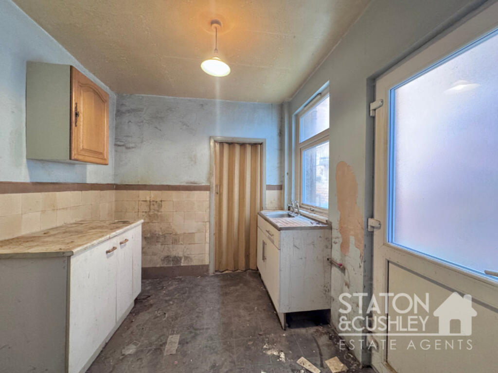 The property appears to be in need of significant renovation. The interior photos show damaged walls, outdated fixtures, and a general lack of maintenance. The kitchen and bathroom require complete refurbishment. The flooring in several rooms is also in poor condition.