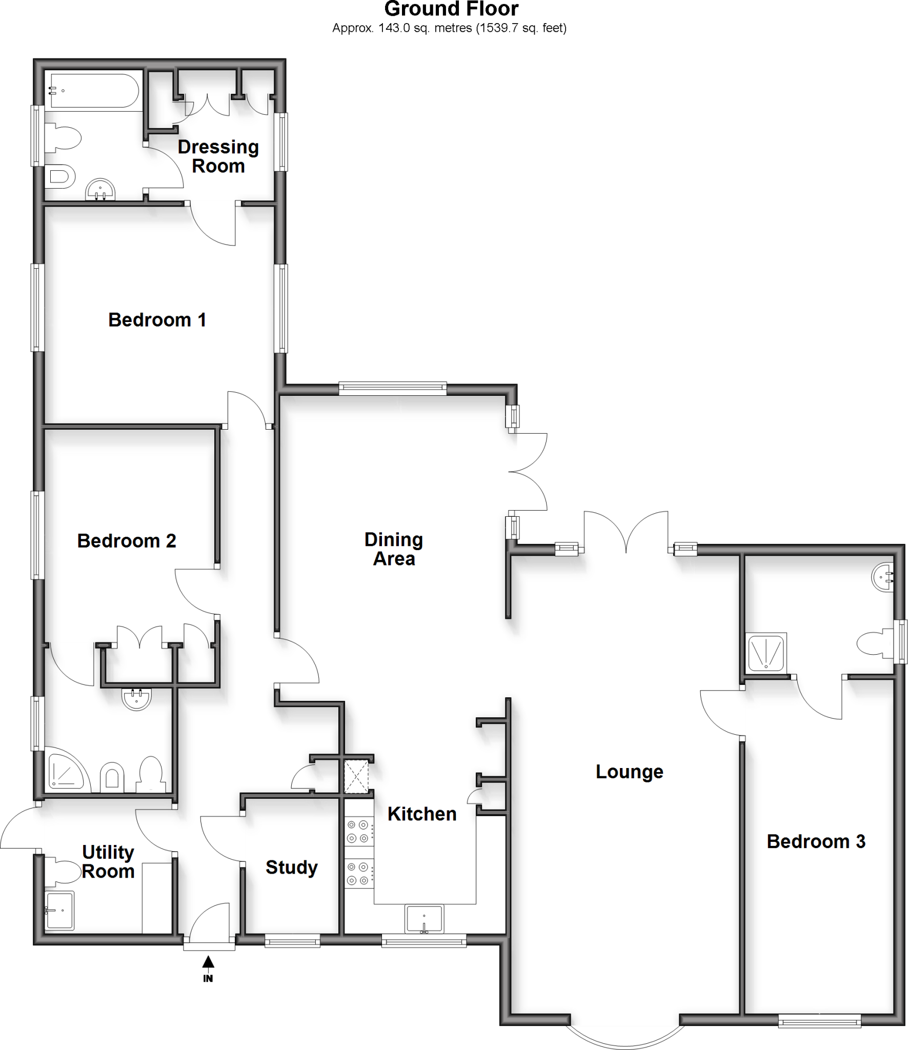 This spacious detached bungalow has three double bedrooms, all with an en-suite bath or shower room and a STUDY for working from home, which could also be used as a nursery. To the front there is ample off street PARKING and to the rear is a large wrap around garden with a useful outbuilding.