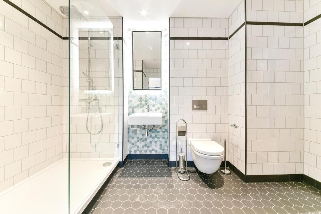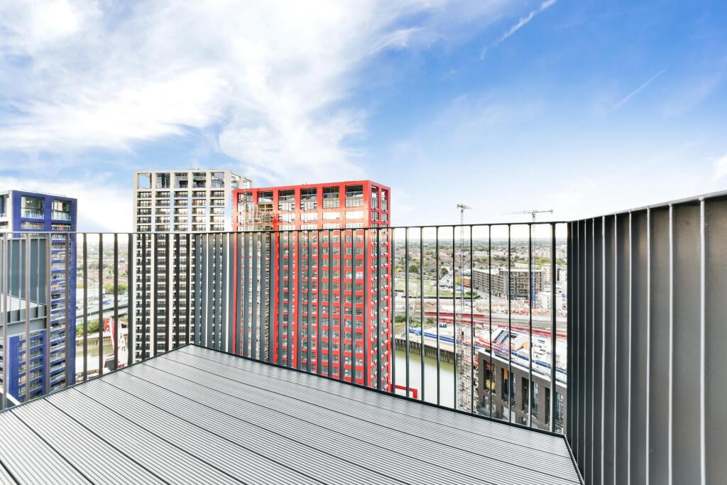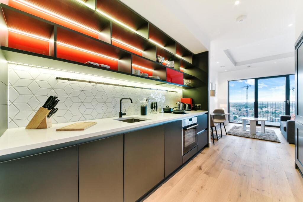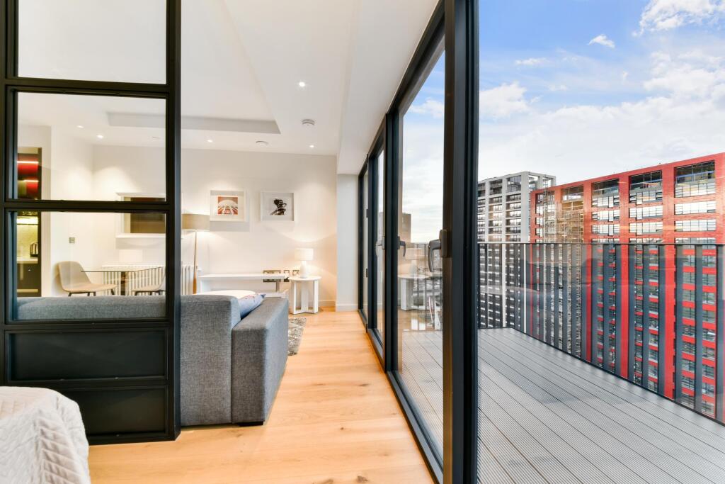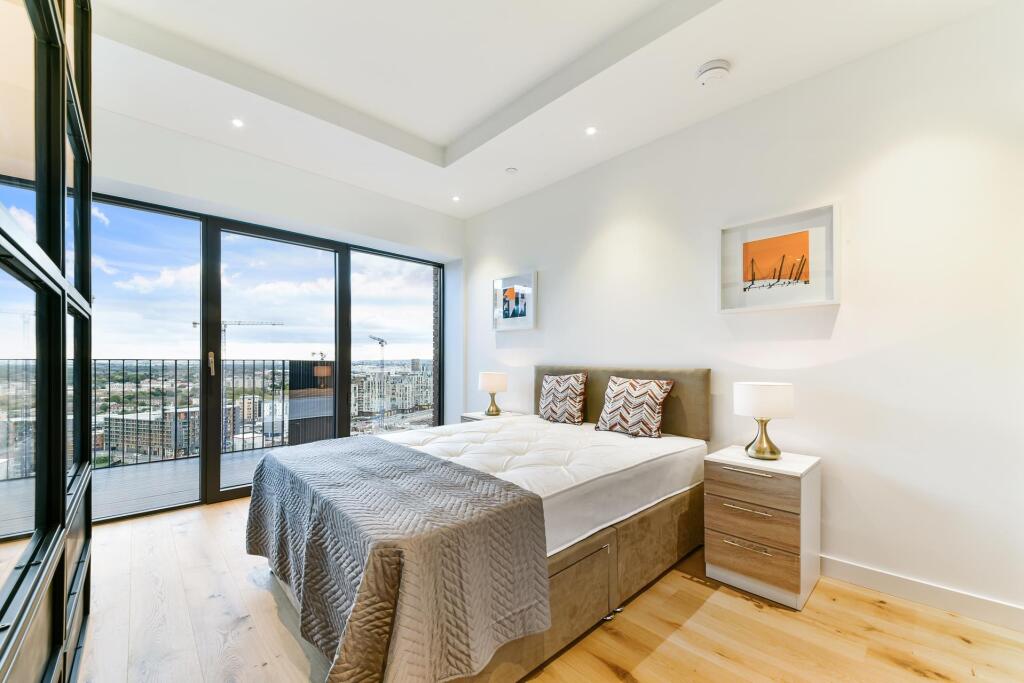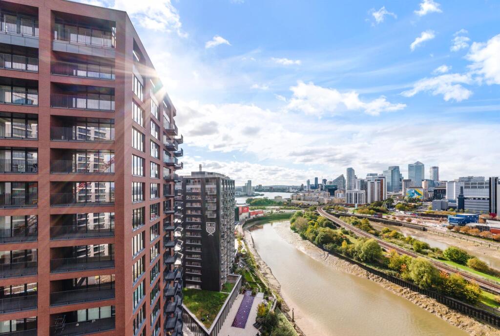 Located on the 19th floor of Modena House, this spacious one-bedroom apartment boasts stunning views of Canary Wharf, the river, and the city skyline. Offering approximately 411 sq ft of living space, the property features an open-plan kitchen and living area, with bedroom area with built-in ward...