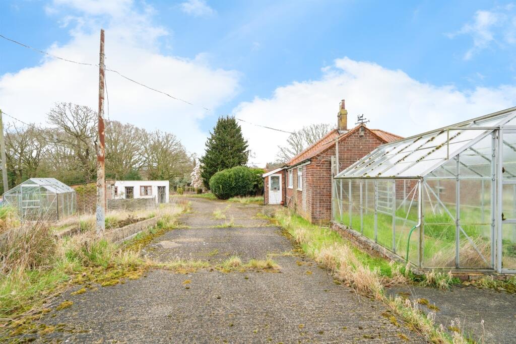 This is a three-bedroom detached bungalow located on Bradfield Road in Southrepps, Norfolk. The property requires significant renovation throughout but offers a large plot with outbuildings. The location is rural, providing a quiet setting, but is somewhat remote from major amenities. The property is listed for sale with William H. Brown at £450,000.