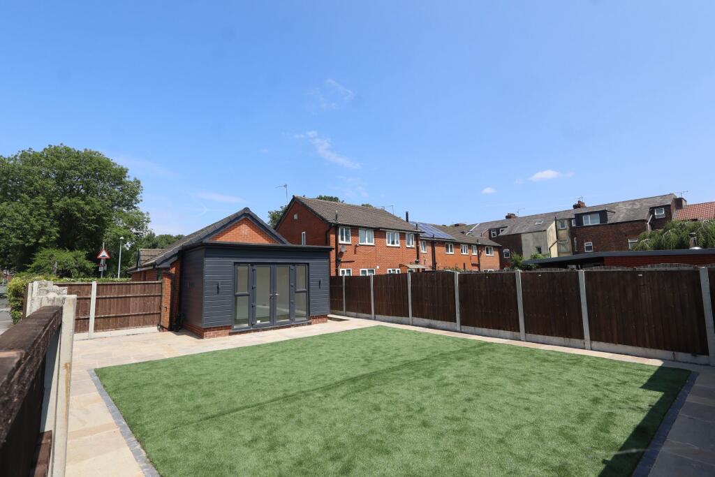 Mishkan Estates presents a fully refurbished 4-bedroom bungalow with a stunning low-maintenance garden featuring astroturf, stonework, and hot tub plumbing, perfect for outdoor enjoyment minutes from Manchester city centre.