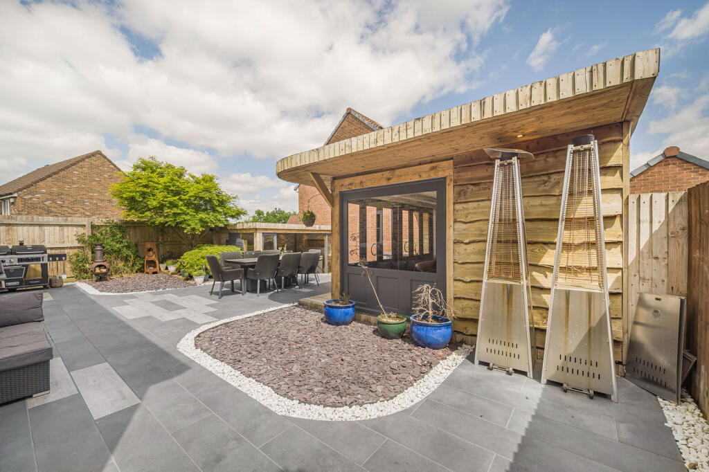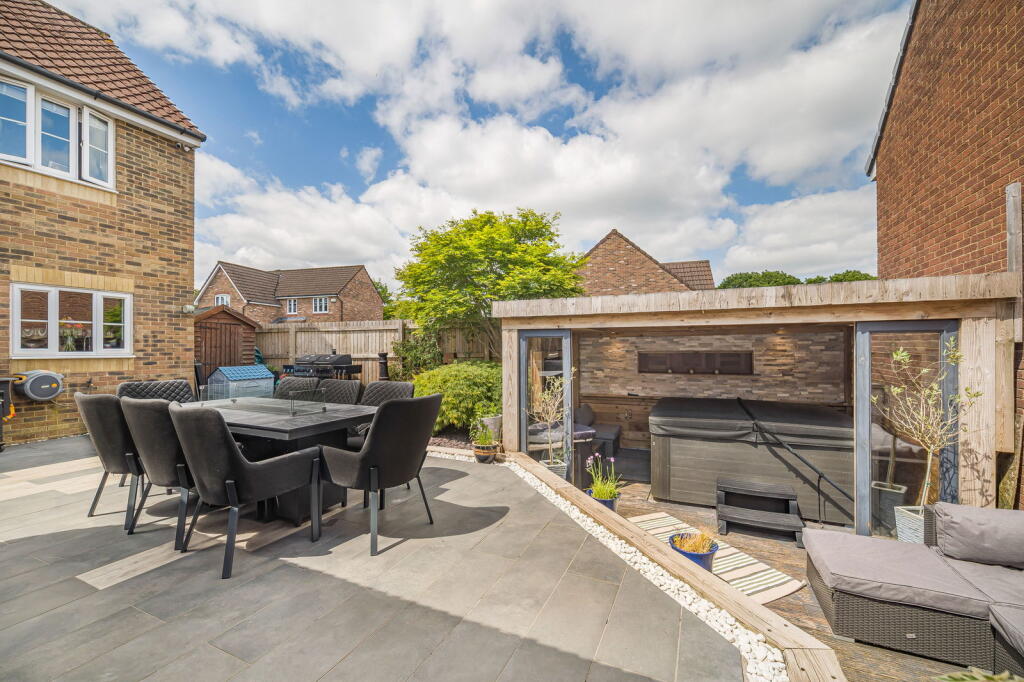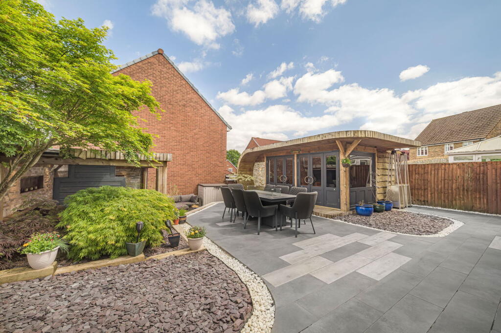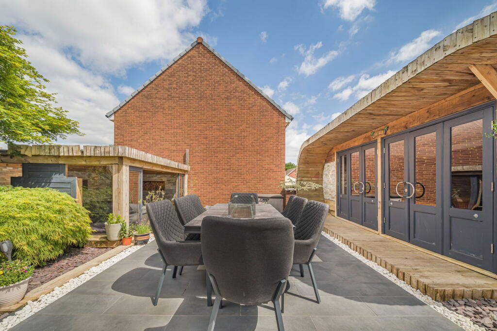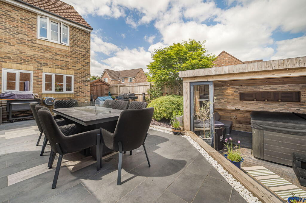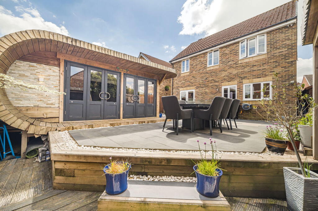 The property is a detached house located in Clos Coed Bach, Blackwood, Caerphilly, South Wales. Based on the provided images, the property appears to be in excellent condition, having undergone recent modernisation and refurbishment. The interior is contemporary and well-presented, featuring a modern kitchen, updated bathrooms, and stylish décor. The property benefits from a well-maintained garden with a substantial outdoor entertaining area including a hot tub and covered seating area. The location is within a residential area of Blackwood. The proximity to Blackwood Primary School and Blackwood Comprehensive School is a positive aspect for families. Several train stations are within a reasonable distance, offering convenient access to public transportation. However, without specific details on local amenities and their proximity to the property, a more detailed assessment of the location score is difficult. The lack of square footage information prevents a precise price per square foot calculation and comparison with local averages. However, considering the property’s apparent excellent condition, modern finishes, and substantial garden, the list price of £370,000 appears to be in line with or potentially slightly above the average price for similar properties in the area, but without plot size and sqft data this is difficult to confirm. Further comparative analysis of similar properties with available sqft data would be beneficial to fully assess the value. The property includes a well-landscaped garden with a patio, hot tub, and a substantial garden building. This suggests a high land score.