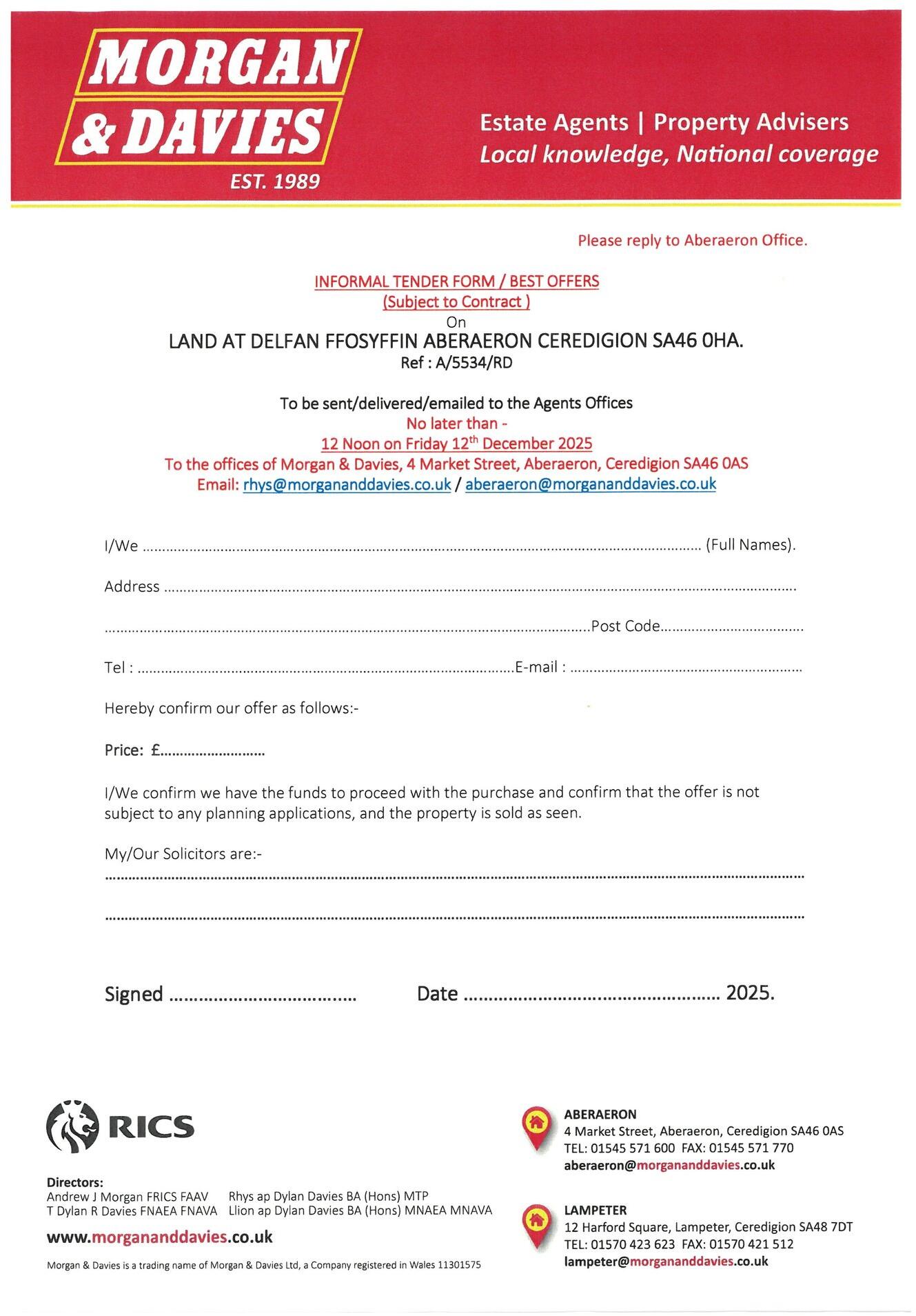 For Sale By Informal Tender. 1.42 Acres parcel with development potential. Ffosyffin village centre. Near Aberaeron - West Wales.