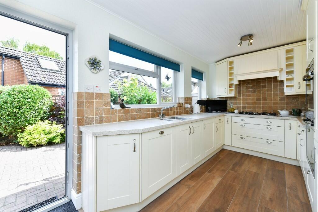 DETACHED 2/3 bedroom BUNGALOW with flexible accommodation and GARAGE, positioned in a quiet CUL-DE-SAC. Deceptively spacious CORNER PLOT with BEAUTIFUL GARDEN, patios, greenhouse, shed and COUNTRYSIDE VIEWS.