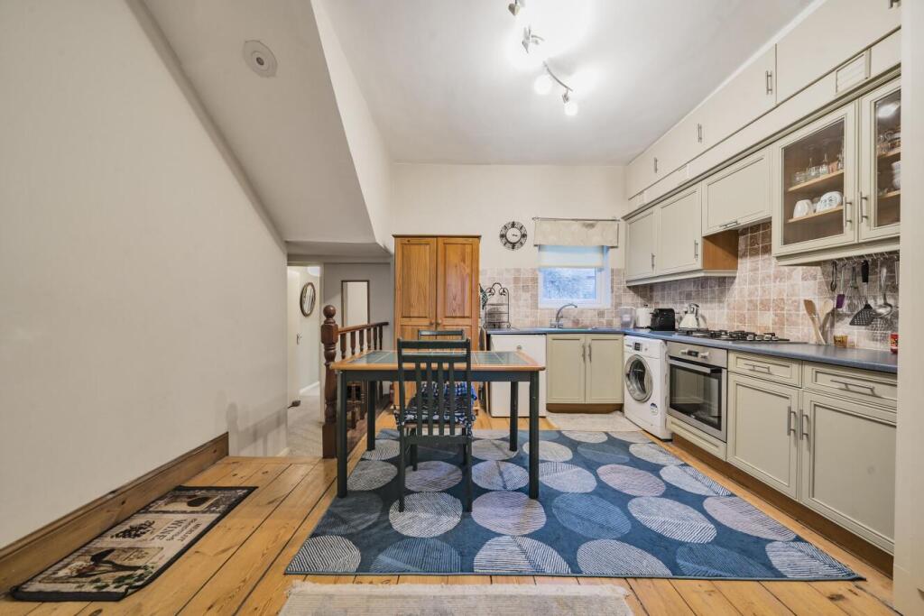 The interior of the property appears well-maintained, though showing a style that may be considered dated by some buyers. The kitchen, in particular, might benefit from modernization. The inclusion of a small private garden is a valuable asset, particularly in this part of London.