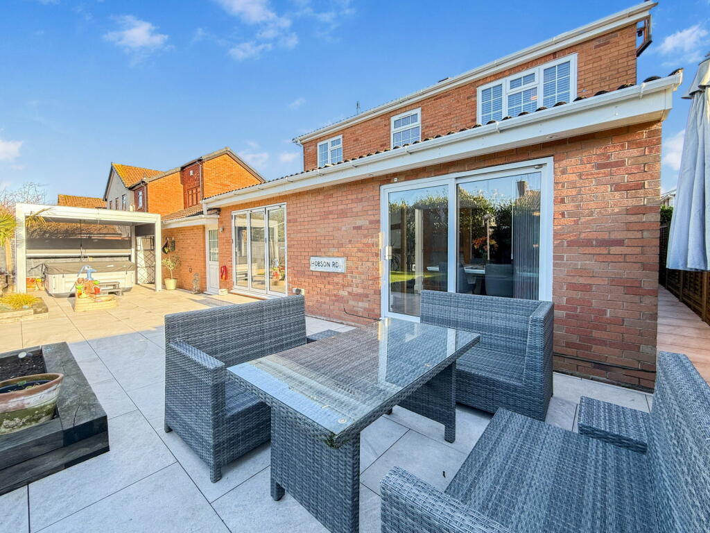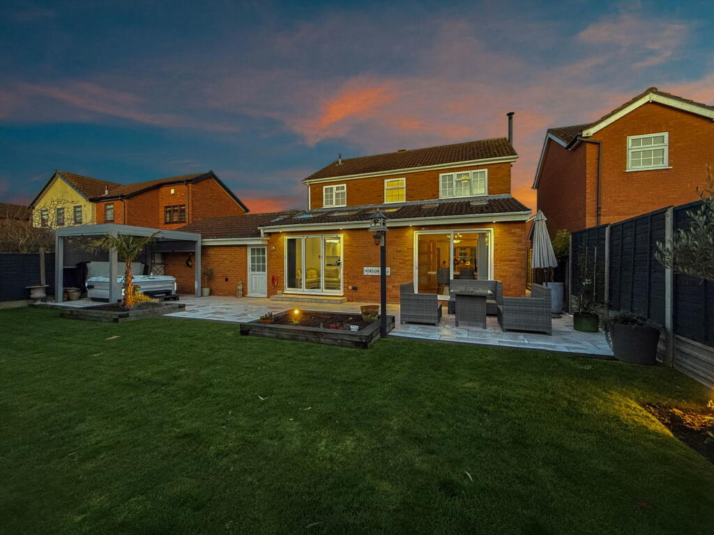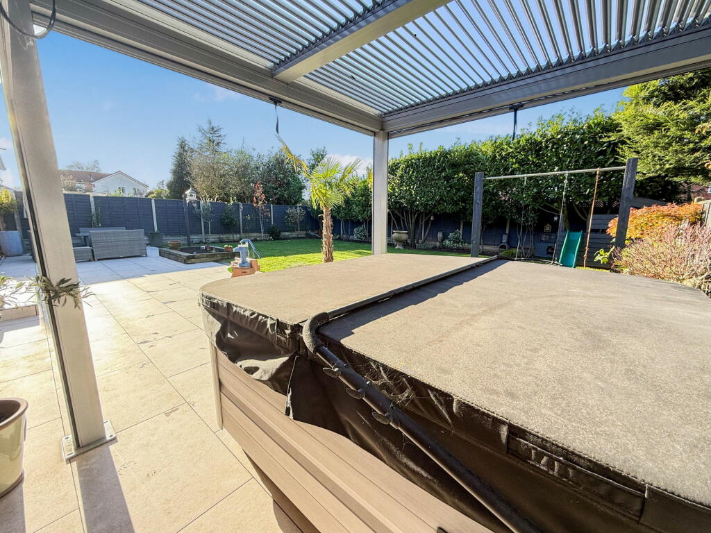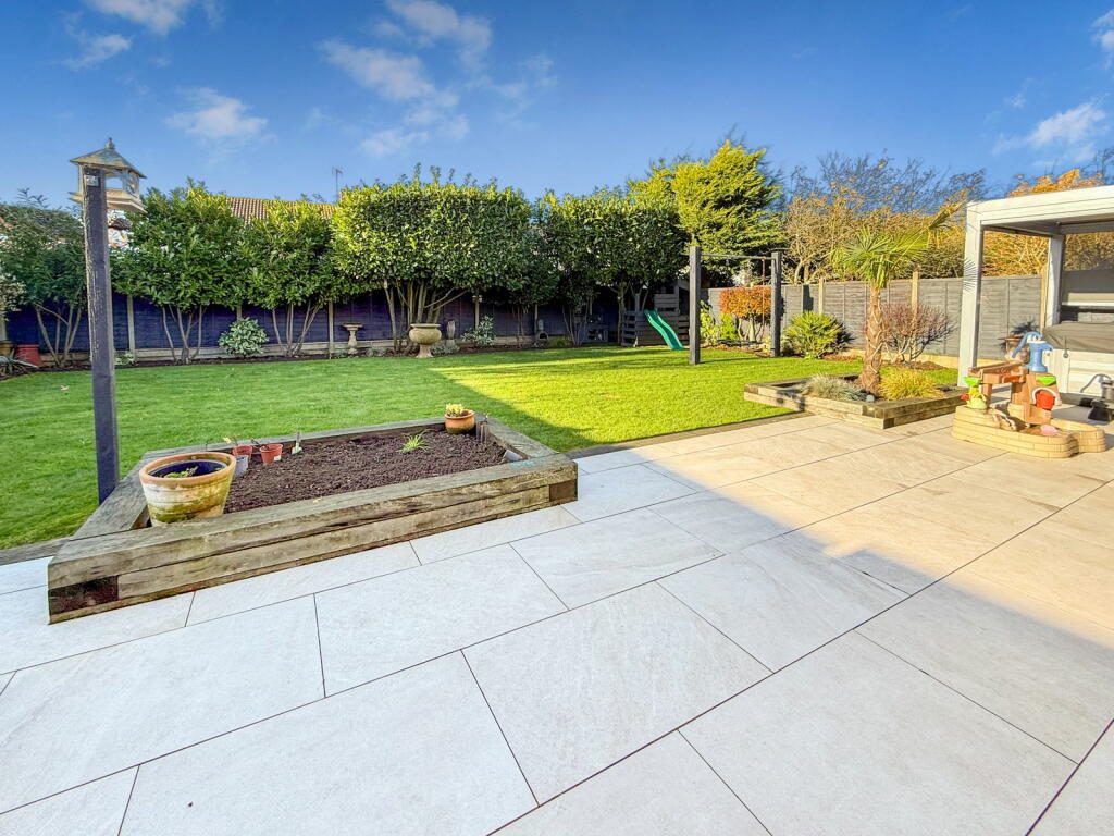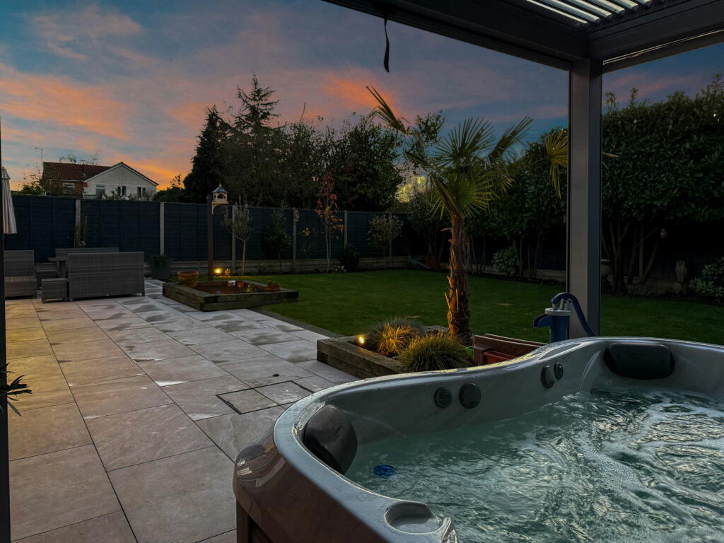 The photos showcase two well-appointed bathrooms, and the bedrooms are of a generous size. The most striking feature is the substantial, well-landscaped rear garden. It offers a large patio area ideal for outdoor entertaining, a spacious lawn, and even a hot tub, enhancing the property’s desirability. The presence of a double garage provides ample off-street parking.
