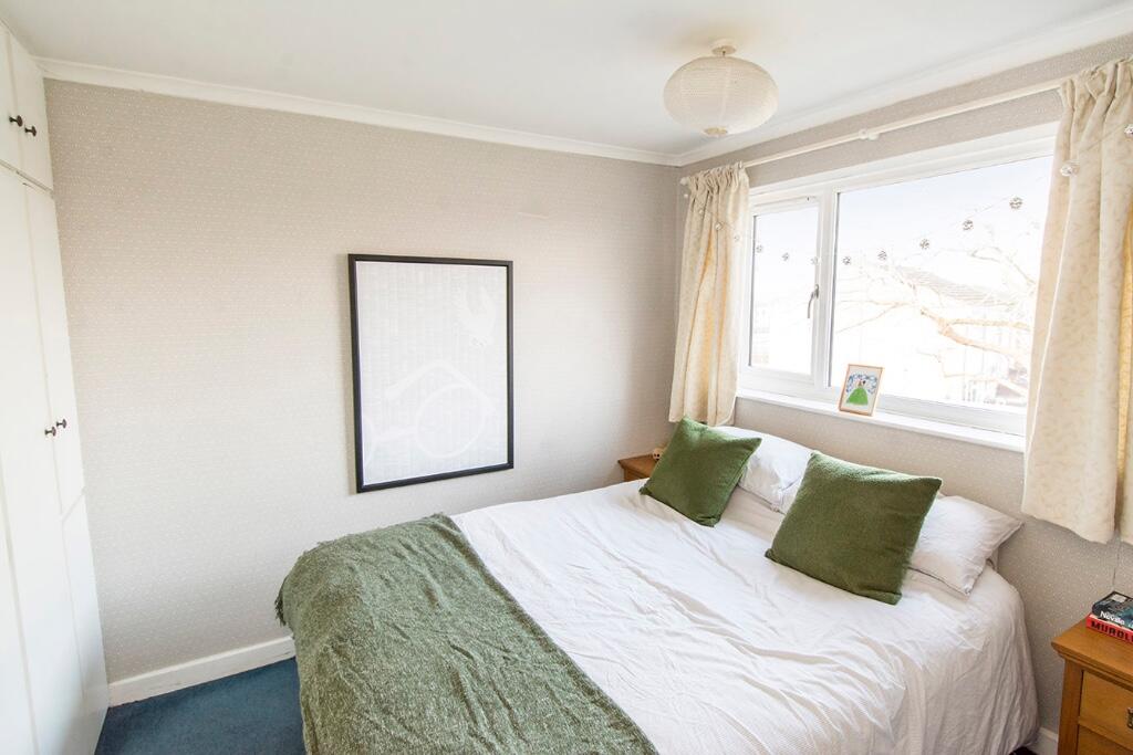 The property appears to be in good condition based on the provided photos. The interior is presented well, with a modern kitchen and updated bathrooms. There is evidence of some minor cosmetic work that may be needed, such as repainting some walls, but overall the property seems well-maintained. The garden is relatively small but well-maintained.