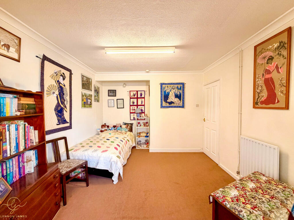 This is a two-bedroom detached bungalow on Ramsey Road, St Ives. The property is listed with Lennon James Property. It is located in a residential area with nearby schools. The property includes a garden and a garage. The interior is somewhat dated and could benefit from modernisation. The asking price is £325,000.