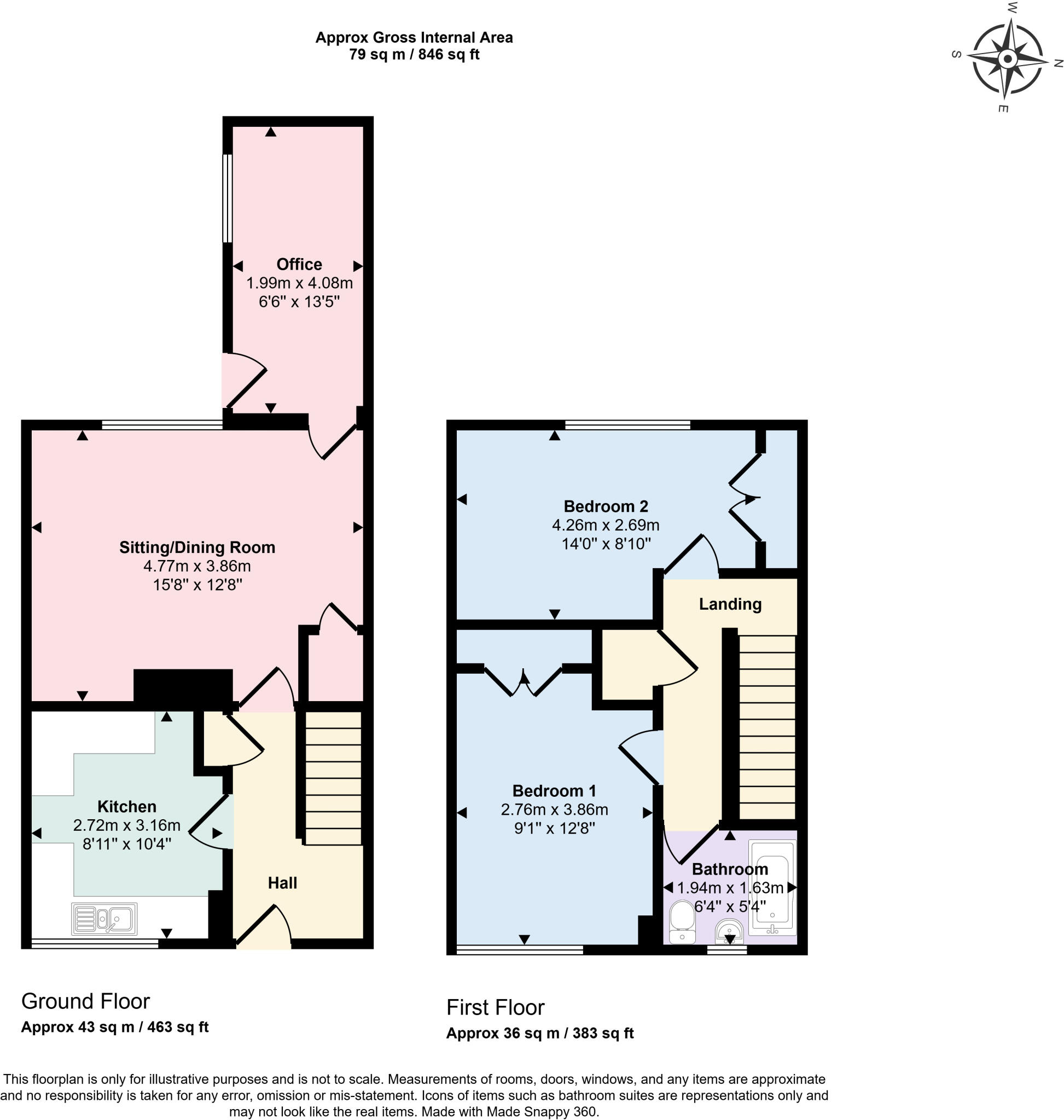 Two double bedroom 846sqft terrace with west facing gardens, full width sitting/dining room and extra rear office/reception.