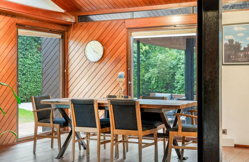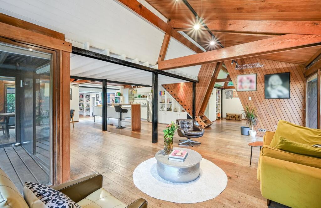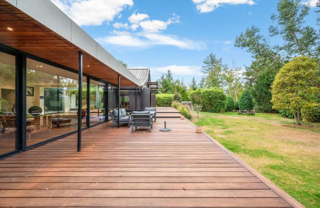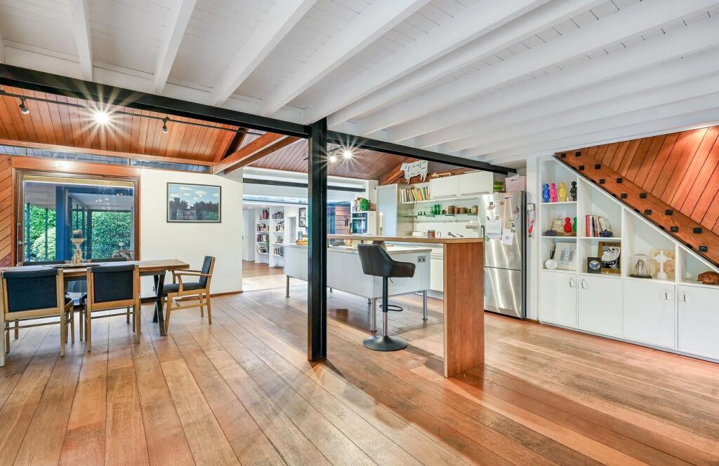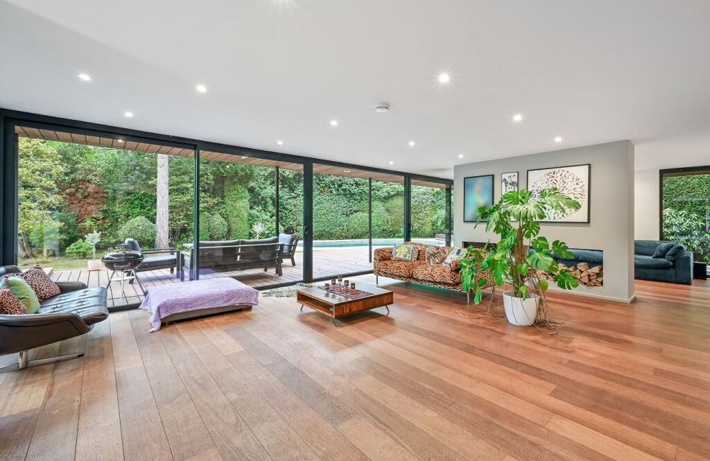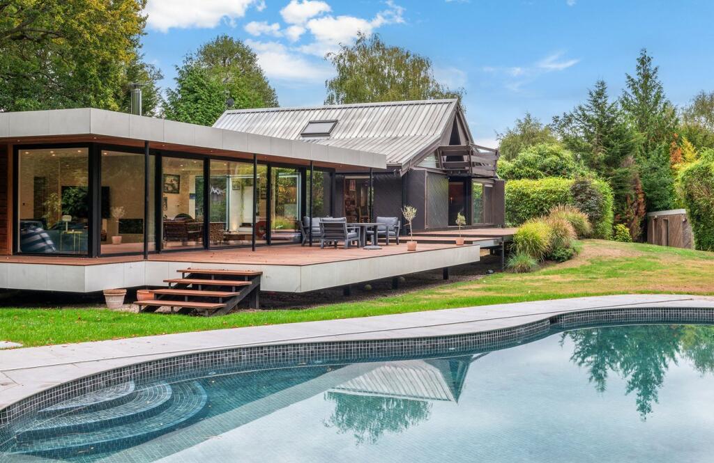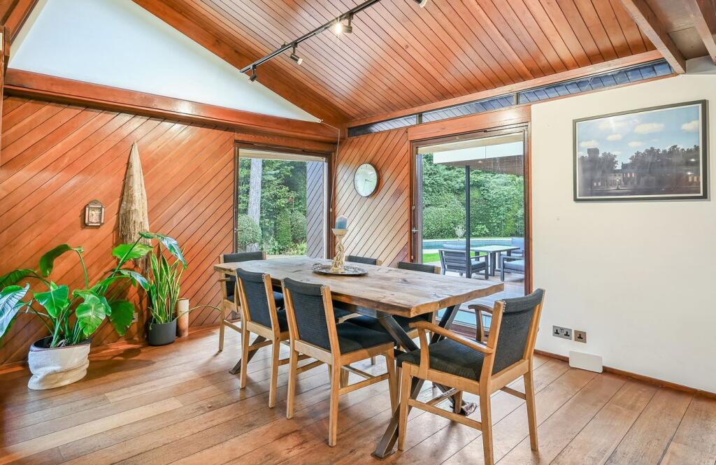 This detached property on Onslow Road, Burwood Park, offers a substantial family home with a large garden and swimming pool. The house has a unique architectural style with exposed beams and wood panelling, which may appeal to some buyers but could require modernisation for others. The property includes three bathrooms and three bedrooms, with a large plot size. The location is desirable, with good access to transportation and schools. While the property is in generally good condition, some aspects of the interior may benefit from updating. The asking price of £2,300,000 is slightly above the average price per square foot for the area, considering the condition and number of bedrooms.