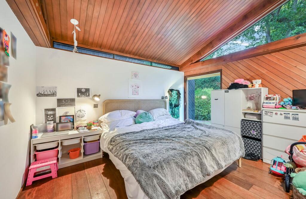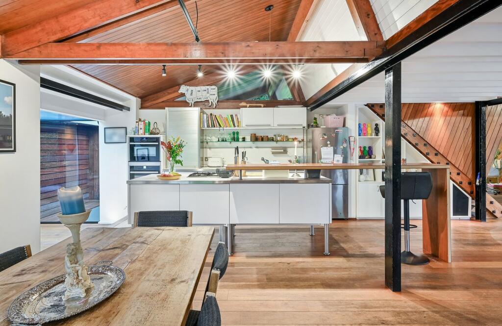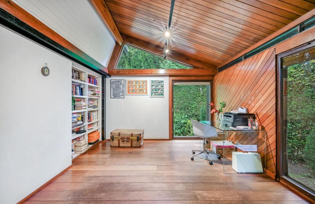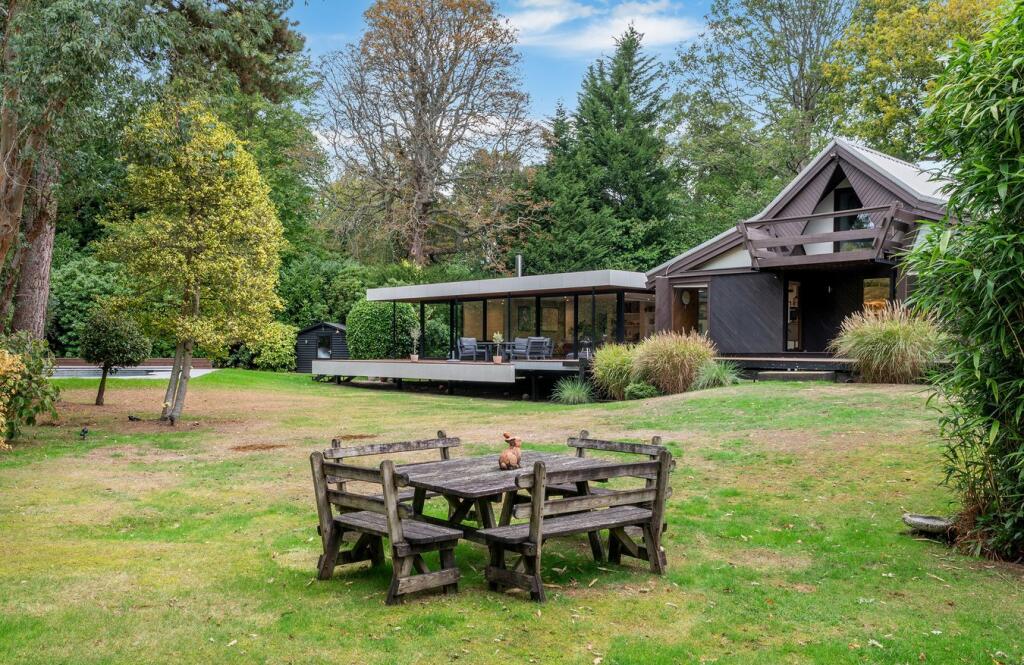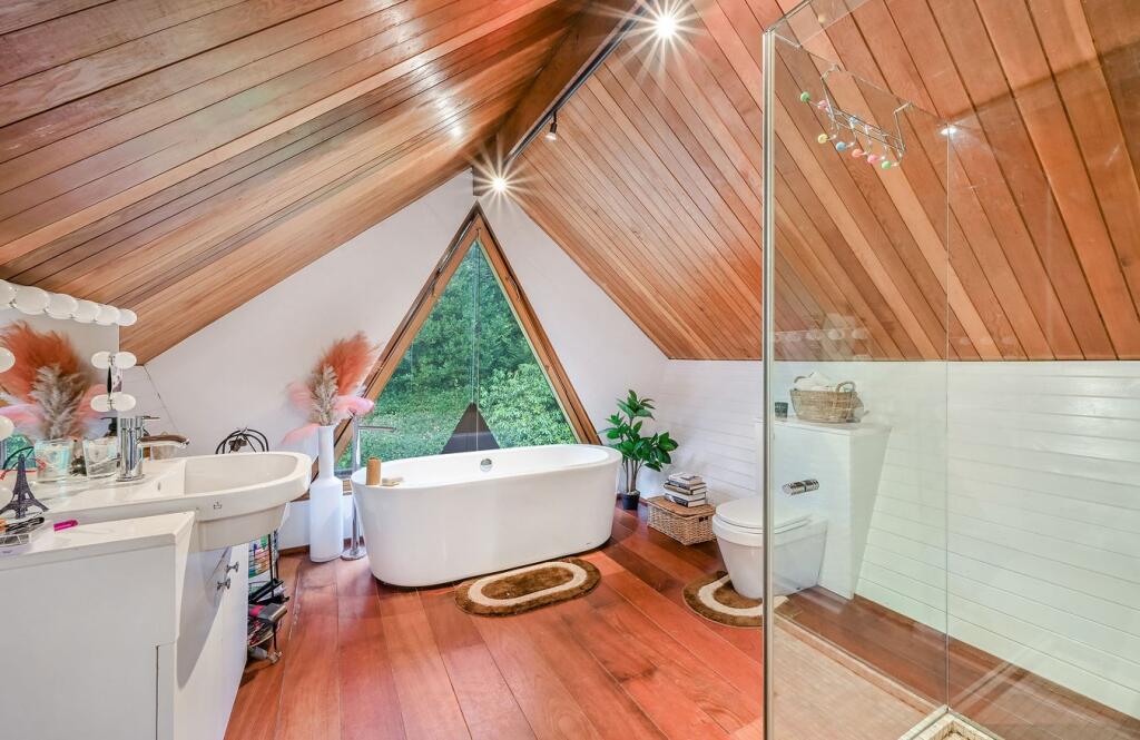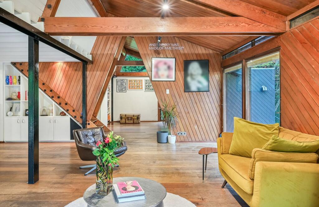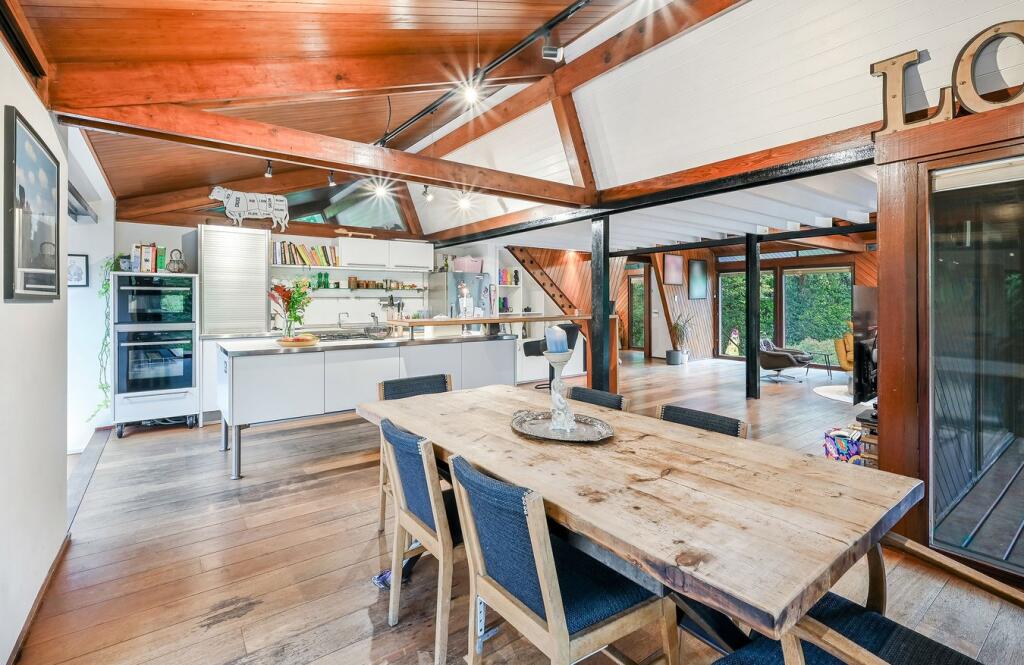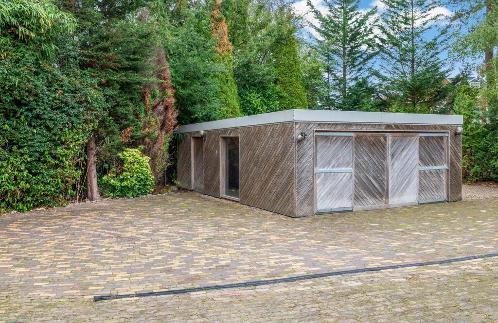 This detached property on Onslow Road, Burwood Park, offers a substantial family home with a large garden and swimming pool. The house has a unique architectural style with exposed beams and wood panelling, which may appeal to some buyers but could require modernisation for others. The property includes three bathrooms and three bedrooms, with a large plot size. The location is desirable, with good access to transportation and schools. While the property is in generally good condition, some aspects of the interior may benefit from updating. The asking price of £2,300,000 is slightly above the average price per square foot for the area, considering the condition and number of bedrooms.