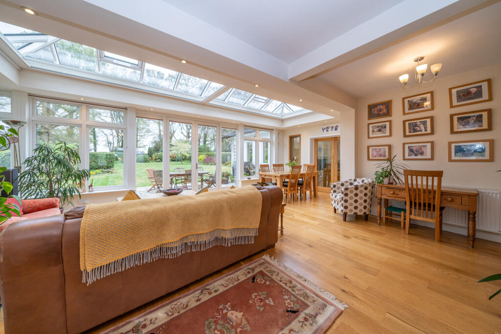 The property itself is a substantial detached house with a large plot size. The images show a well-maintained property that has been well-kept and is presented in excellent condition. The house appears to have undergone some modernisation, blending traditional features with contemporary updates. The large garden provides ample outdoor space, adding significant value to the property. A conservatory is also visible, which is a desirable feature for many buyers.