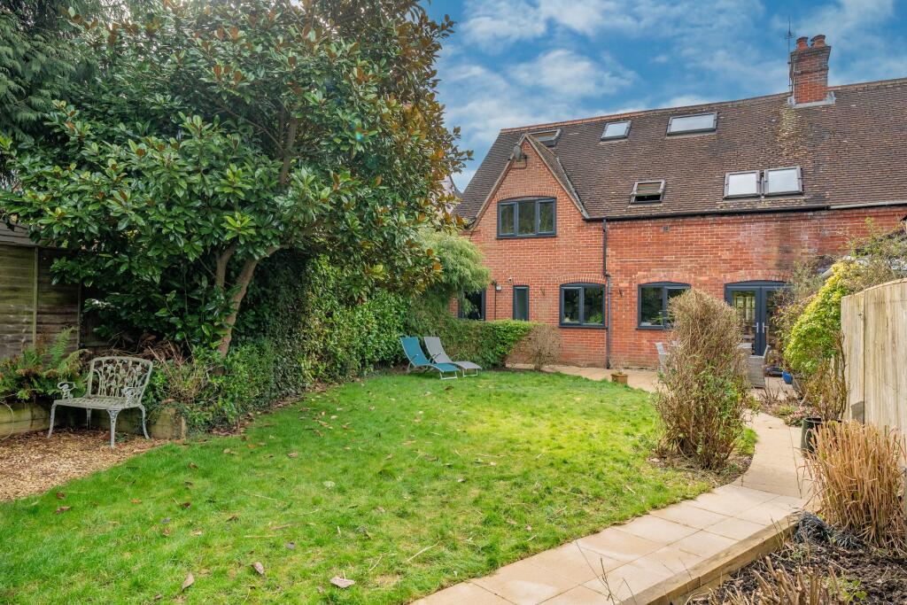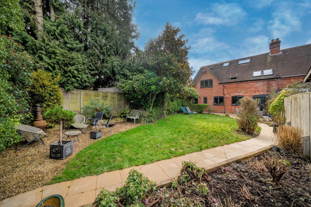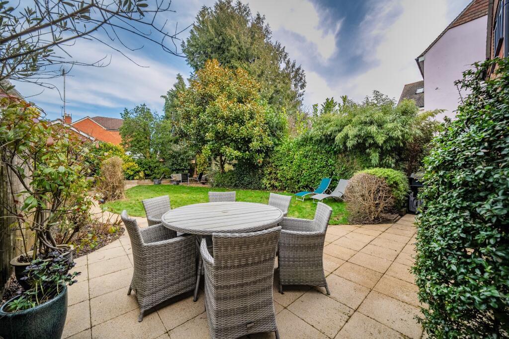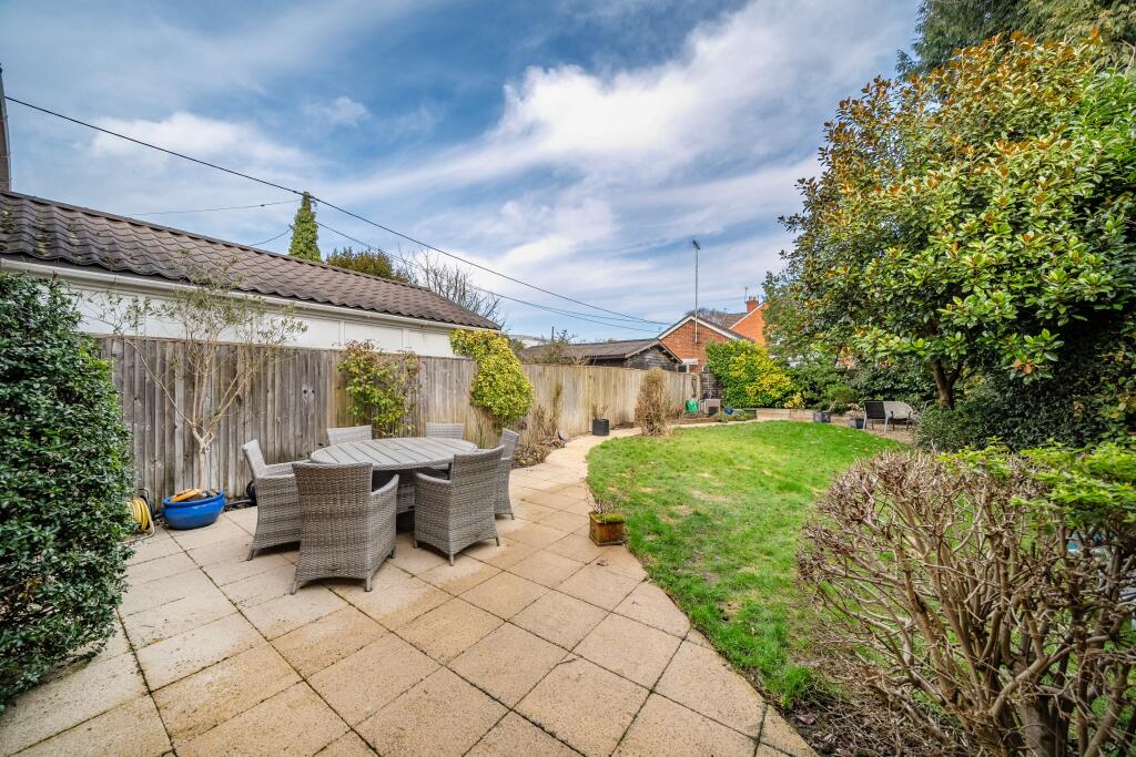 The property includes a sizeable garden, offering ample outdoor space. The garden is well-maintained and features paved patio areas as well as lawn space.