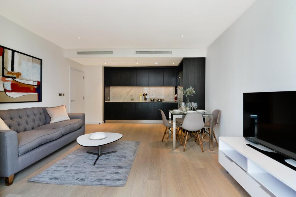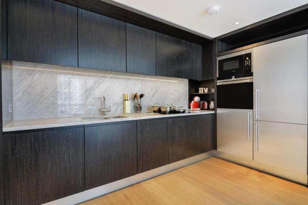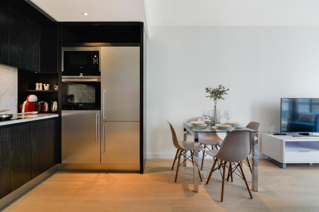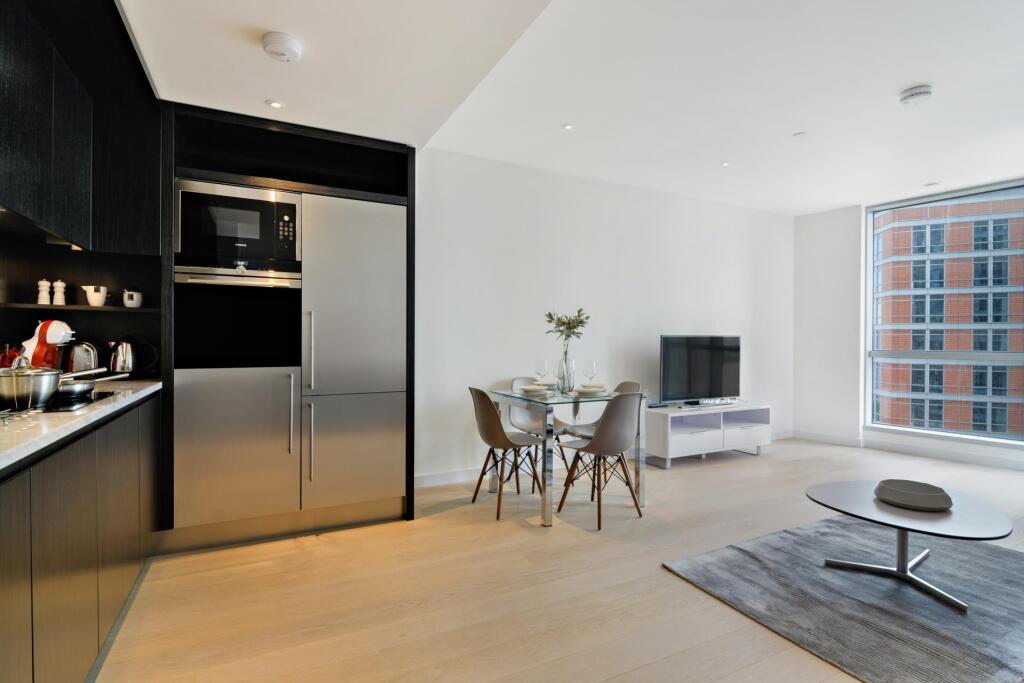 This is a modern apartment in a high-rise building in London. The property appears to be in excellent condition, with a modern kitchen and bathroom. The location is convenient for access to Canary Wharf and other parts of London. The lack of a garden is a drawback for some buyers. Overall, this property would likely appeal to young professionals or investors looking for a modern, well-located apartment.