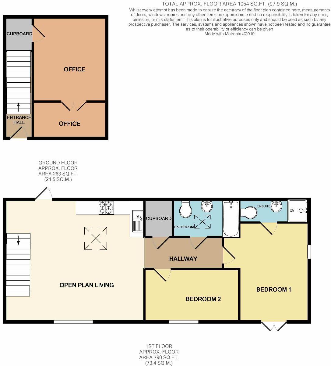 A modern energy efficient property ideal for those who working from home as the ground floor offers a large office space. Entrance hall, open plan living/kitchen/dining room, two double bedrooms, en suite shower room and bathroom. Garden and off road parking.