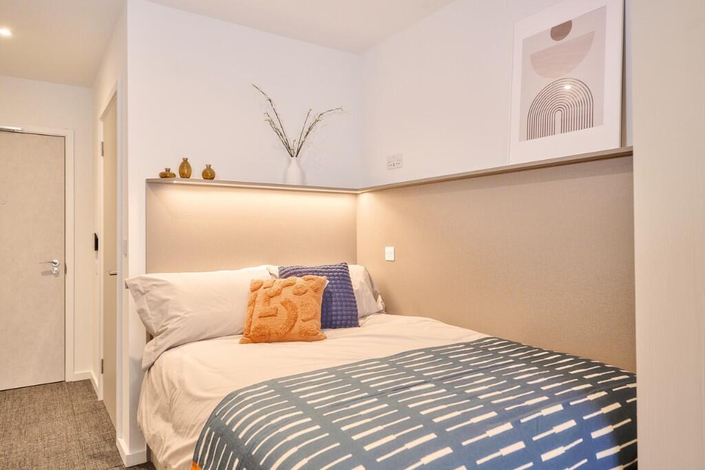 Modern private studio with your own kitchen (microwave oven, fridge/freezer, kettle, toaster), large bed, smart TV, and ensuite shower. Enjoy resident perks like weekly fitness classes, private dining areas, outdoor BBQ, and more.