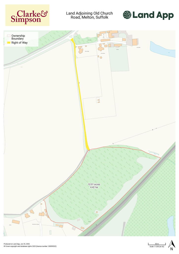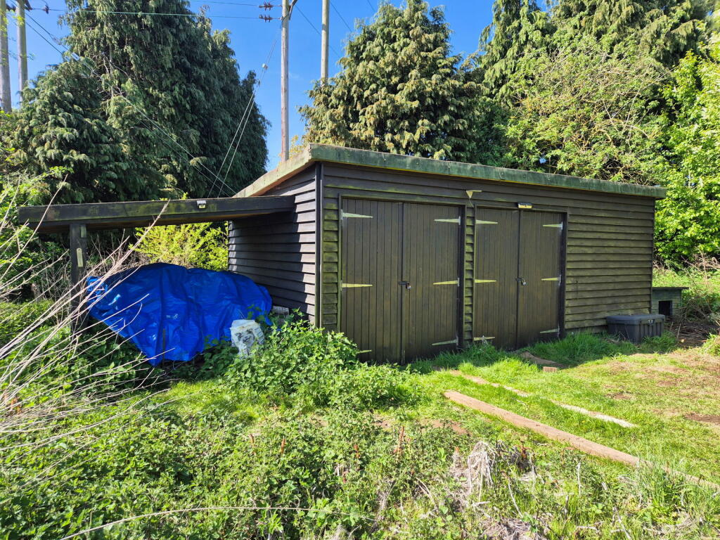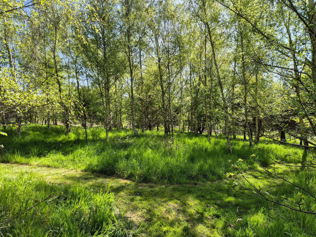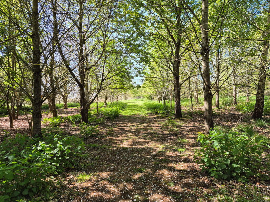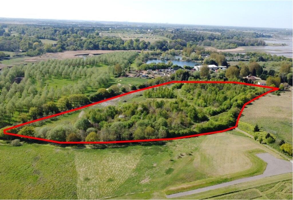 The property is a large plot of land located in Melton, near Woodbridge, Suffolk. The land appears to be mostly undeveloped, featuring trees and open grassy areas. There is also a shed-like structure on the property. The land benefits from its proximity to Melton (Suffolk) railway station and several schools.
