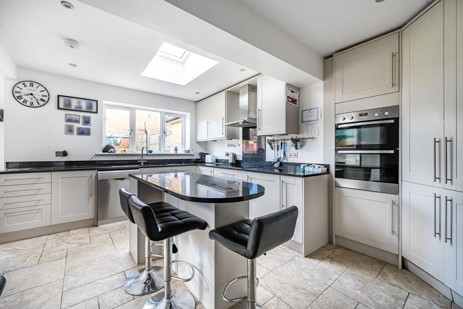This four-bedroom detached house in Bishops Field, Aston Clinton, is presented as a family home. The property features two bathrooms and a garage. The kitchen has undergone a recent upgrade, giving a modern feel, and boasts a sizeable island. The living area is spacious, with access to a rear extension that also includes a dining area. The bedrooms are presented in varying states of furnishing and readiness. The garden offers a good-sized area suitable for outdoor activities, while parking is readily available.