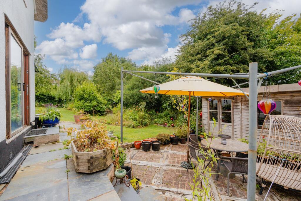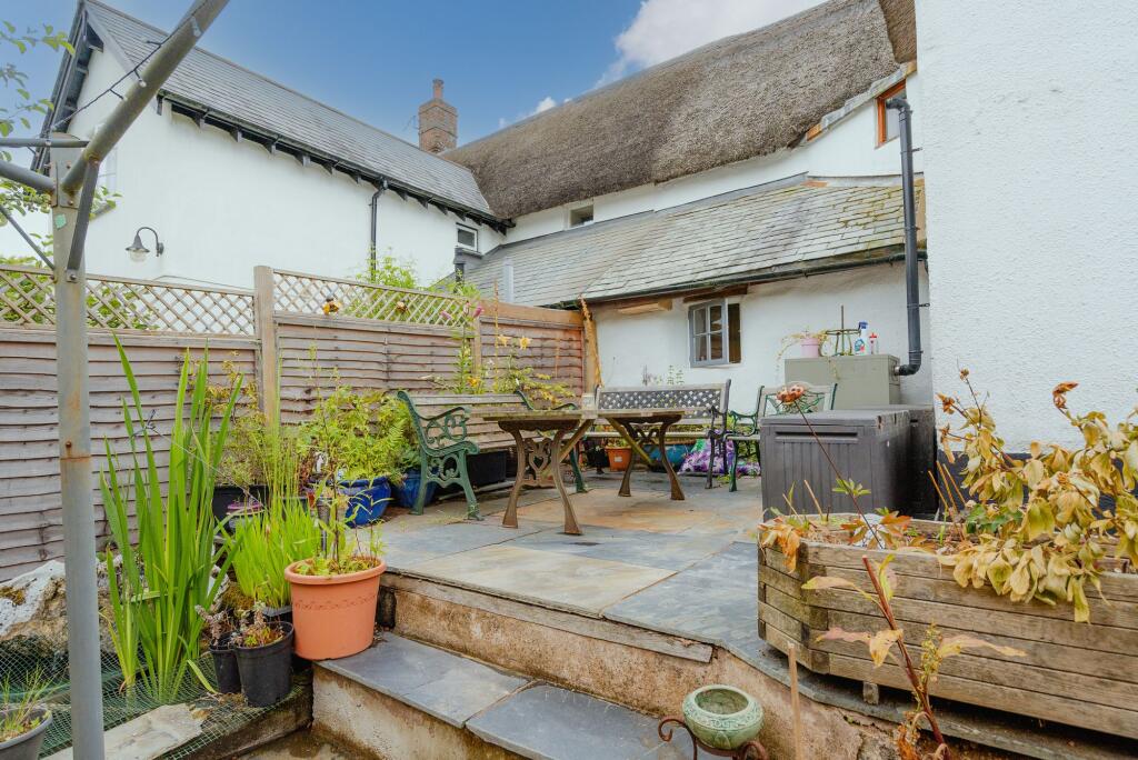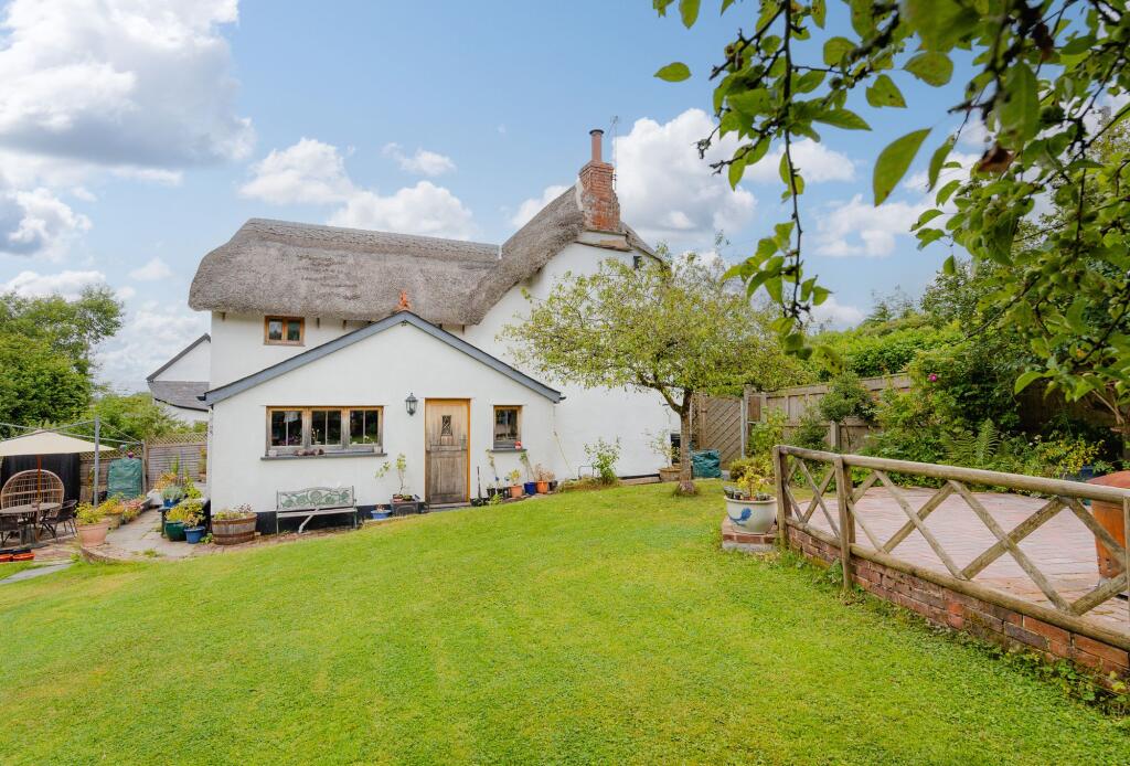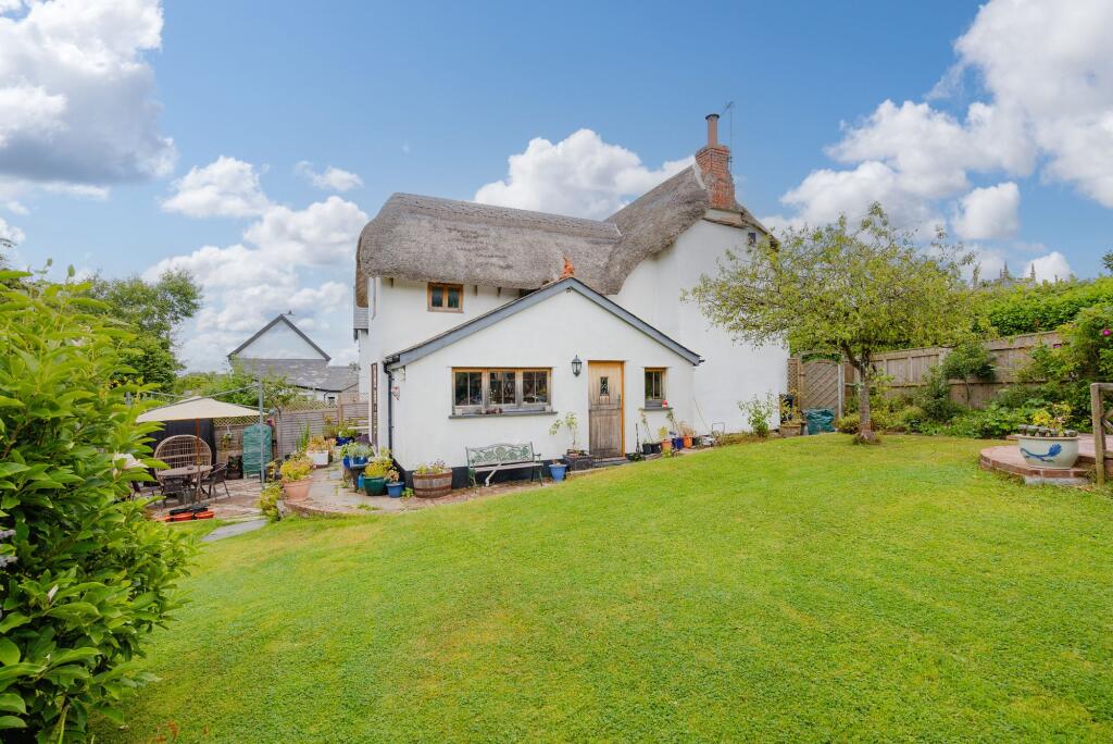 Pretty Grade II Listed thatched cottage with wonderful gardens and useful outbuildings.