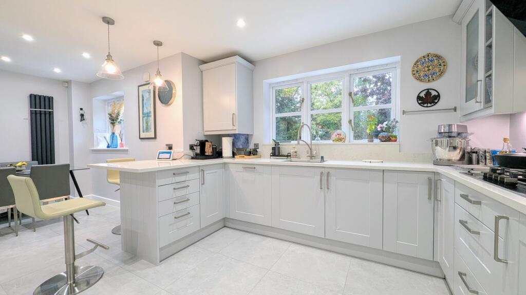 Stunning 4-bed detached house at a cul-de-sac. Modern sophistication meets traditional charm. Spacious layout incl. 2 reception rooms, refitted kitchen, double garage, and larger-than-average garden with potential for outdoor living.