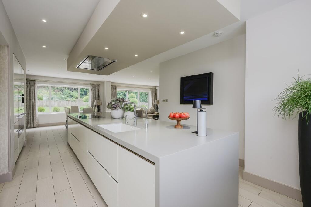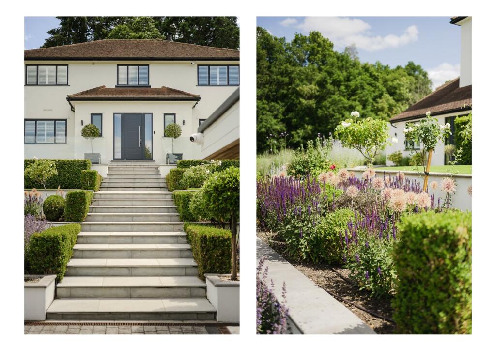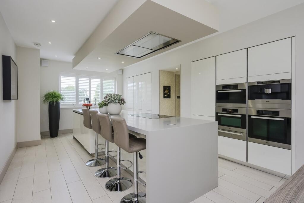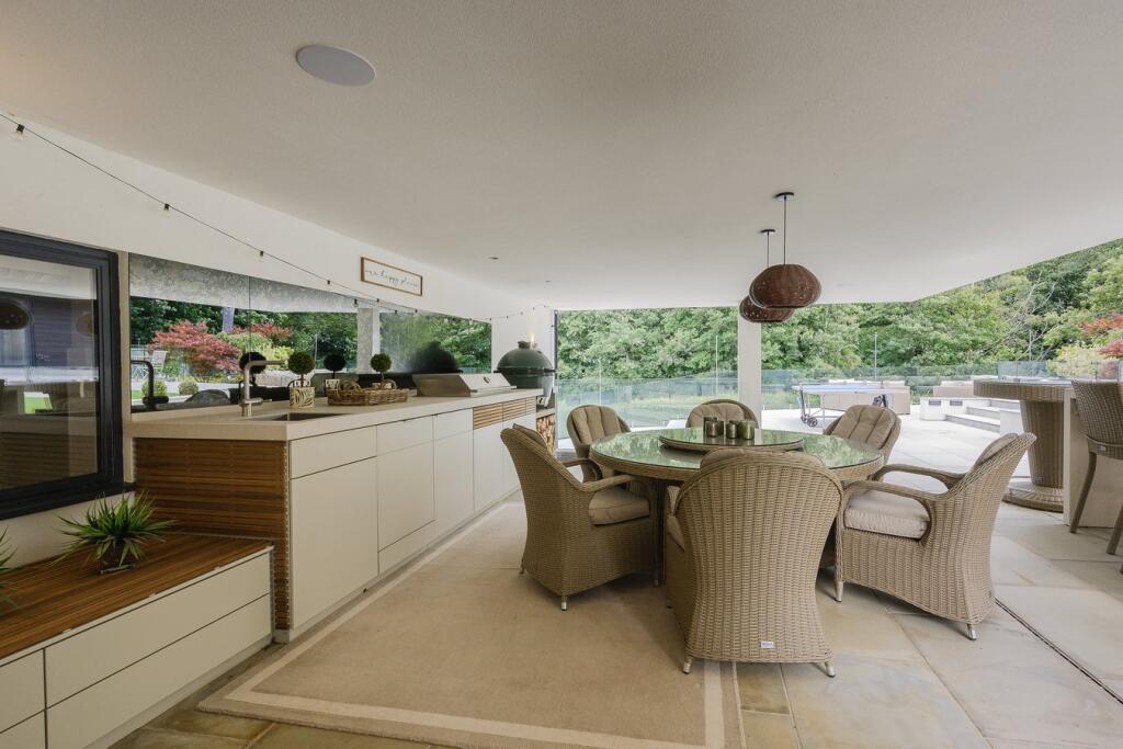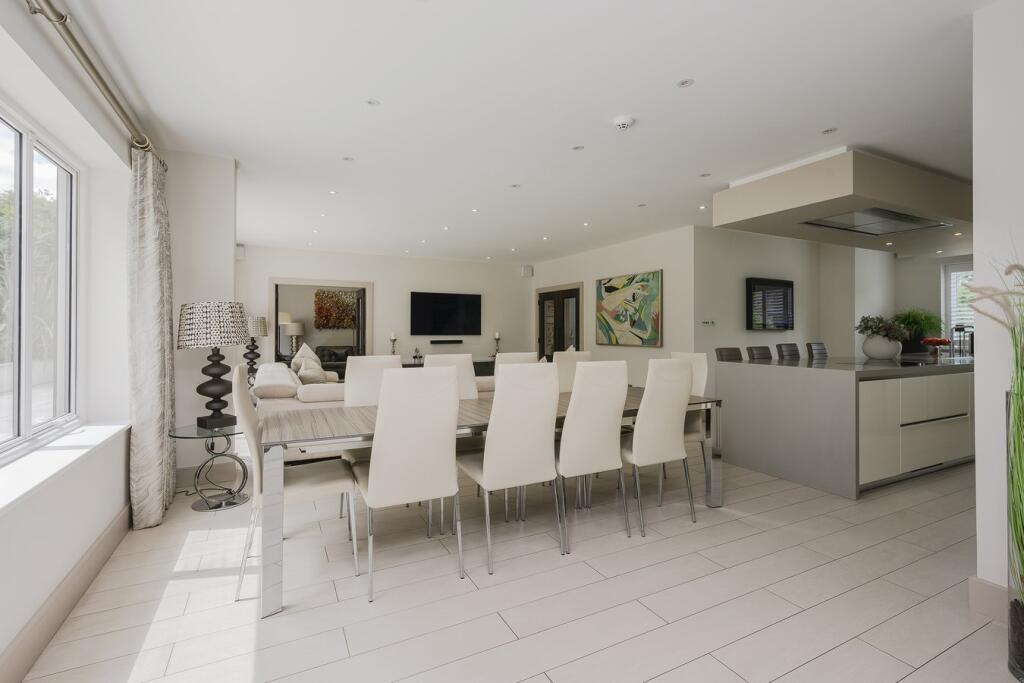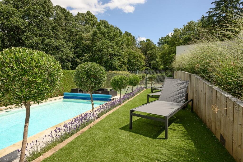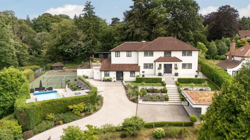 A substantial detached property in excellent condition with modern interiors and a large garden featuring a swimming pool, tennis court, and outdoor kitchen. Located near schools and train stations.