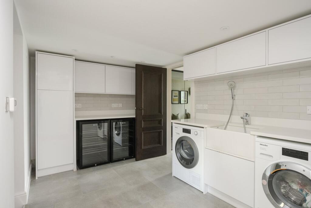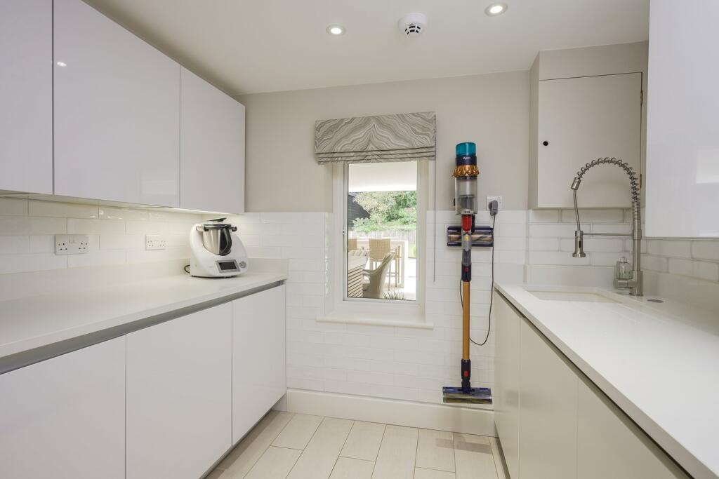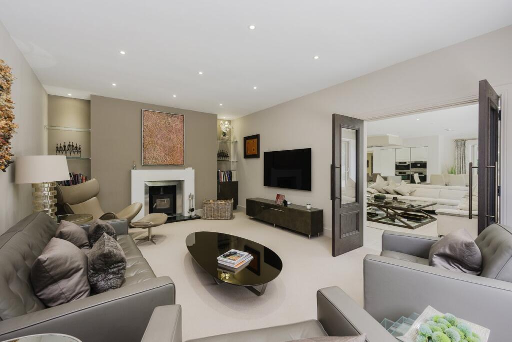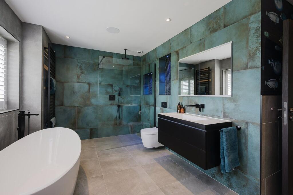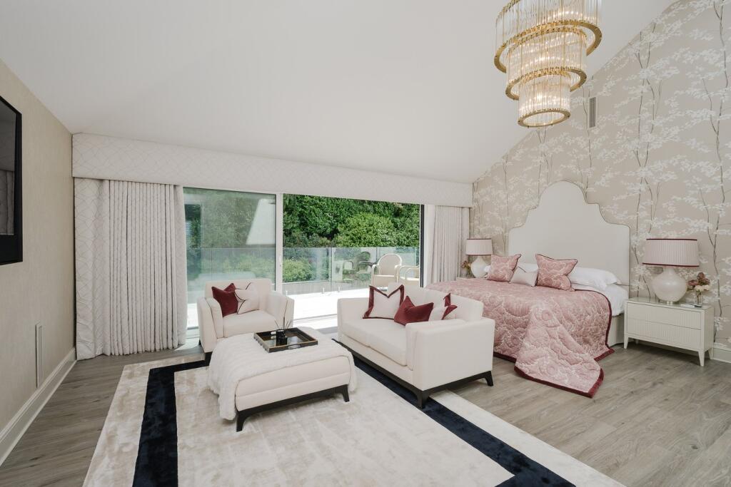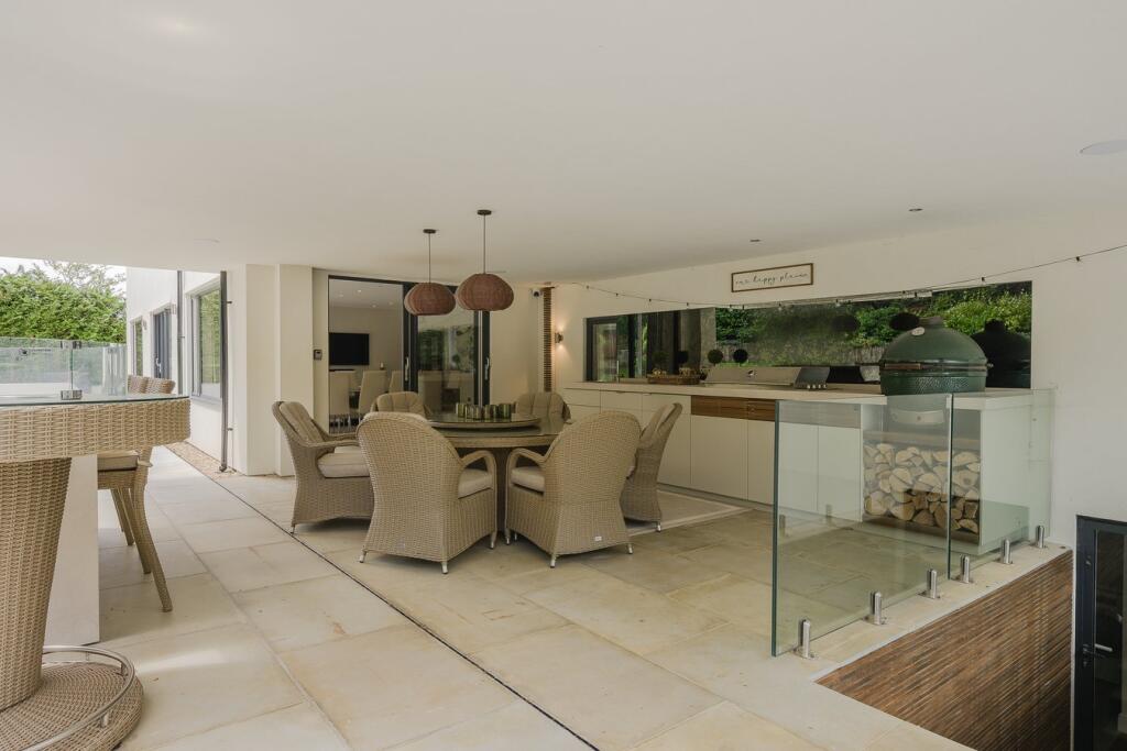 A substantial detached property in excellent condition with modern interiors and a large garden featuring a swimming pool, tennis court, and outdoor kitchen. Located near schools and train stations.