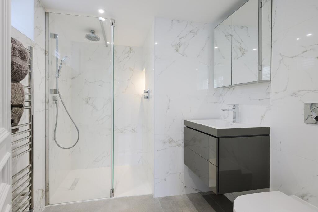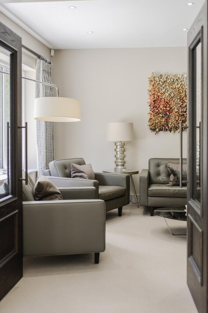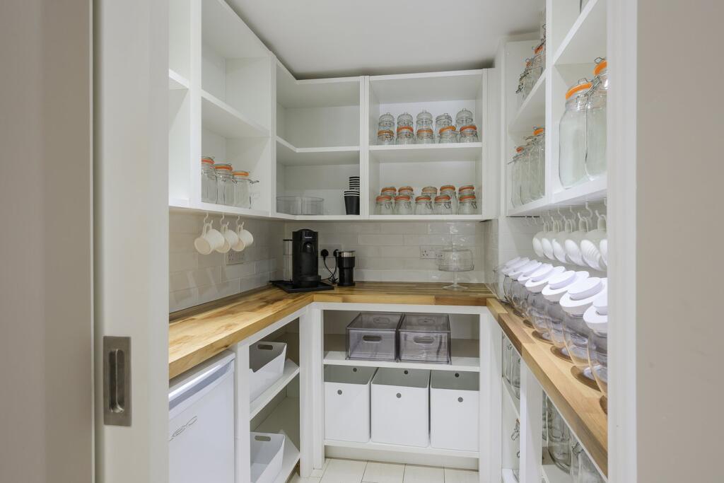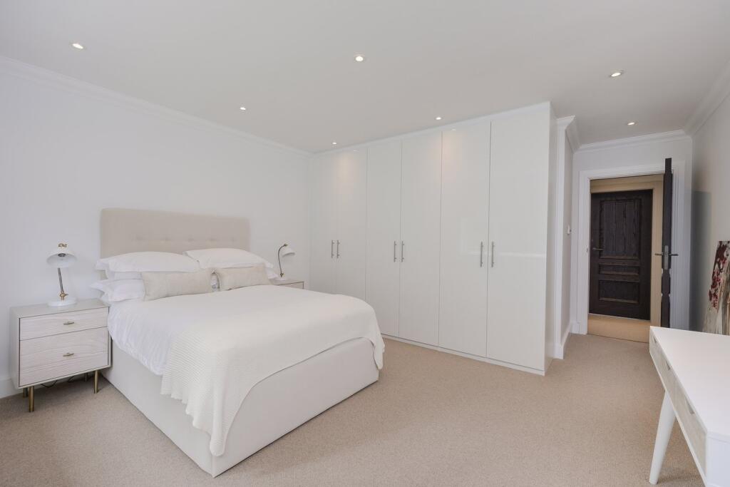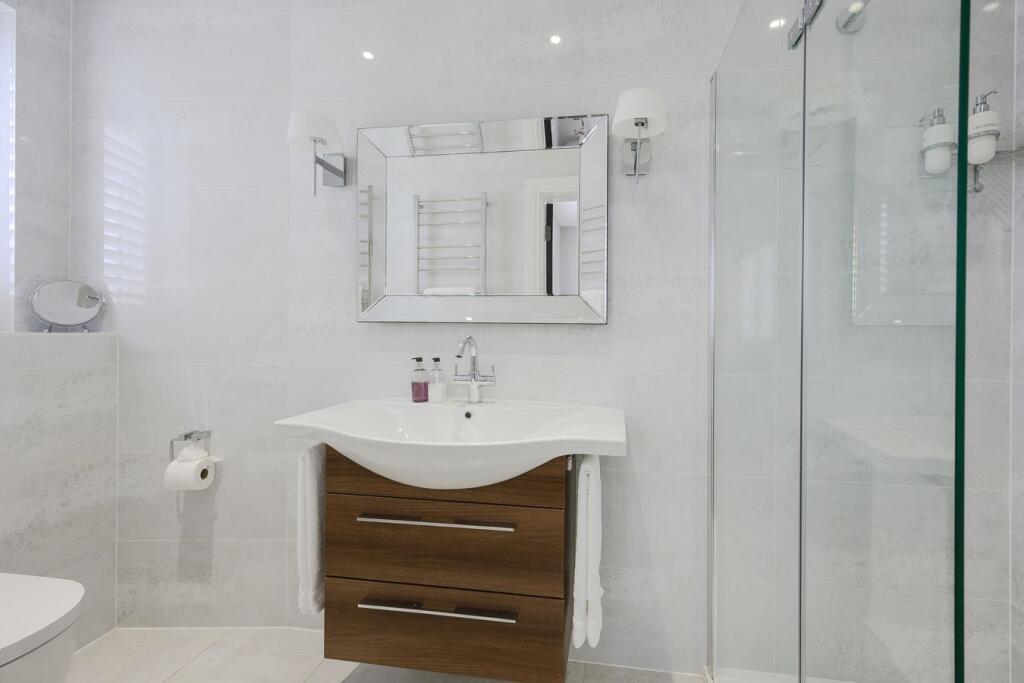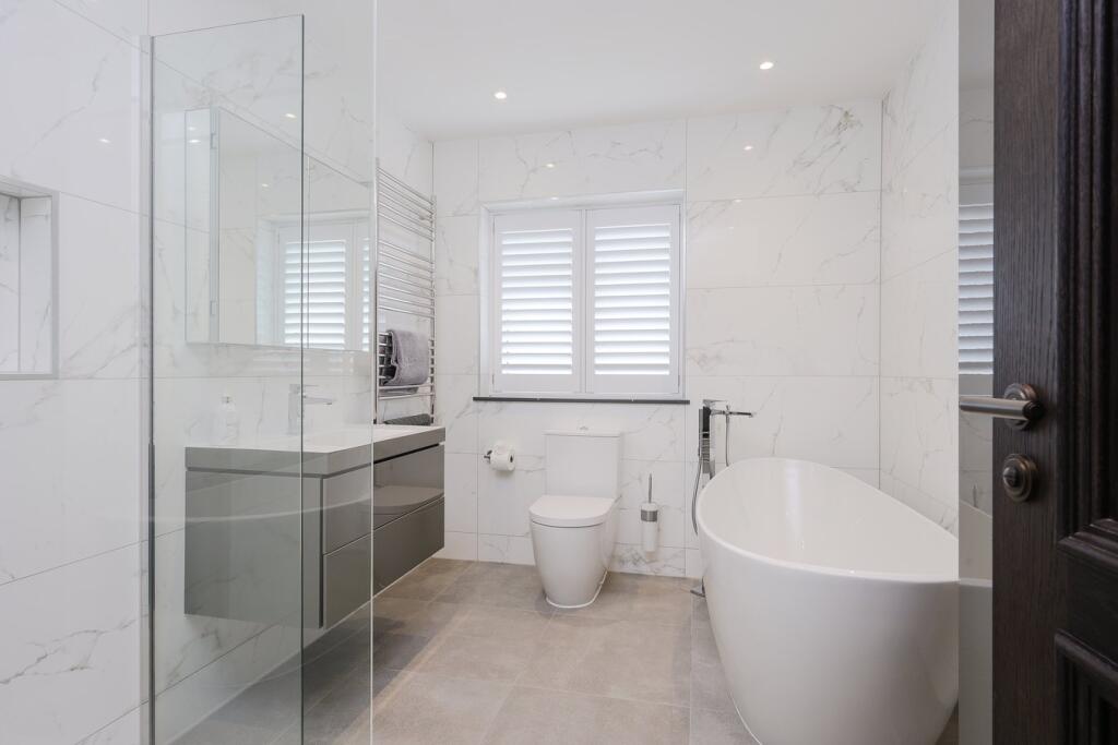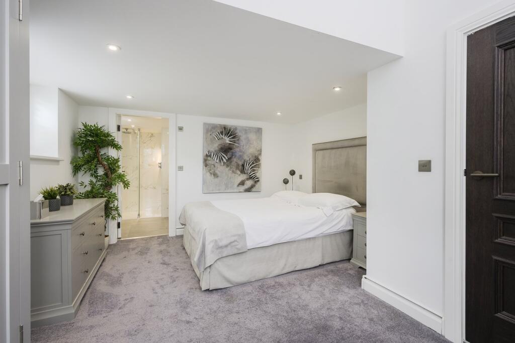 A substantial detached property in excellent condition with modern interiors and a large garden featuring a swimming pool, tennis court, and outdoor kitchen. Located near schools and train stations.