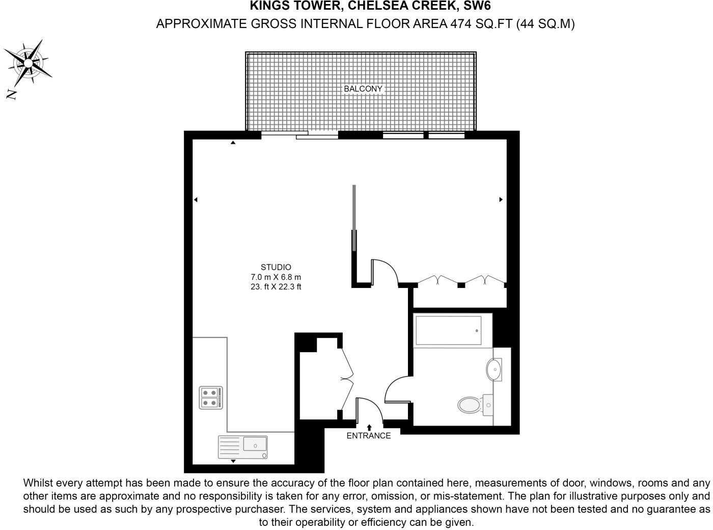 A fantastic studio apartment with a balcony set within a popular Fulham/Chelsea riverside neighbourhood, in King's Tower. This contemporary apartment has a bright and ample living space featuring modern integrated kitchen appliances, wood flooring, good bedroom space, double wardrobe and large ba...