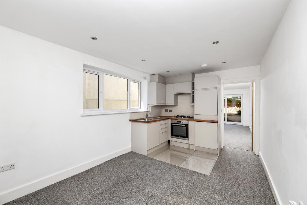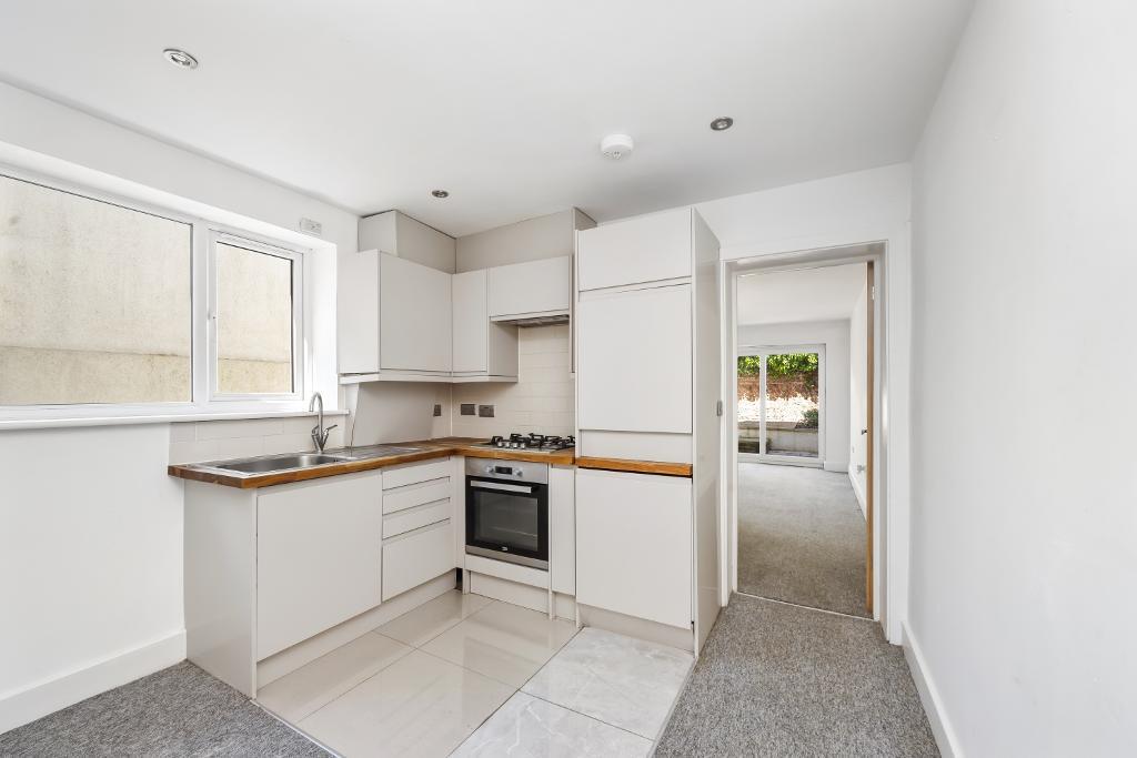 The property is a 1 bedroom apartment located on Portland Road in Hove, East Sussex. The apartment appears to be newly renovated or in excellent condition, with modern fixtures and fittings throughout. The kitchen and bathroom are contemporary in style. The property benefits from a private, paved rear garden.