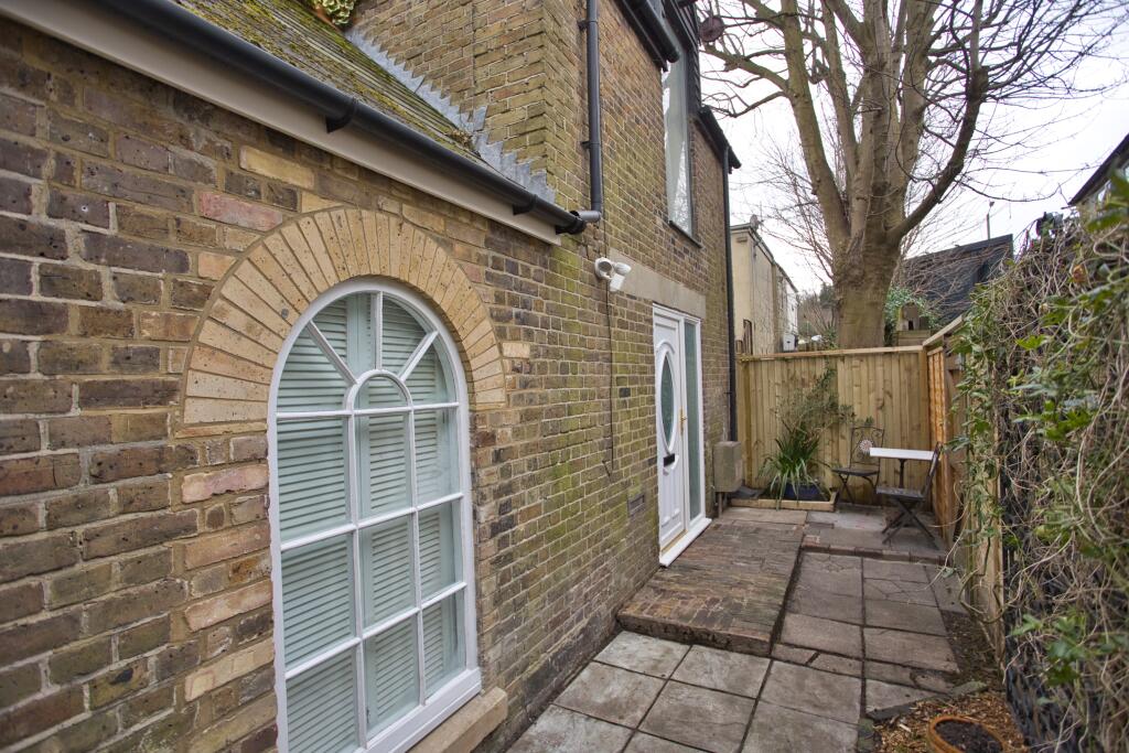 The property itself appears to be well-maintained and recently renovated or converted. The interior features modern fixtures and fittings, a contemporary kitchen, and a stylish bathroom. The exposed brickwork and wooden beams add character, suggesting a blend of modern and traditional styles. The property includes a small, enclosed patio area, providing some outdoor space.