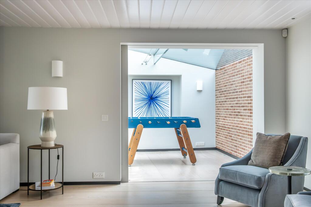 The property appears to be in excellent condition, having undergone a tasteful and high-quality renovation. The images showcase a modern, stylish interior with high-end finishes. The extension appears to be seamlessly integrated with the original structure, enhancing both the living space and the overall aesthetic appeal. The property benefits from a well-maintained garden, visible in several photographs, adding to its desirability.