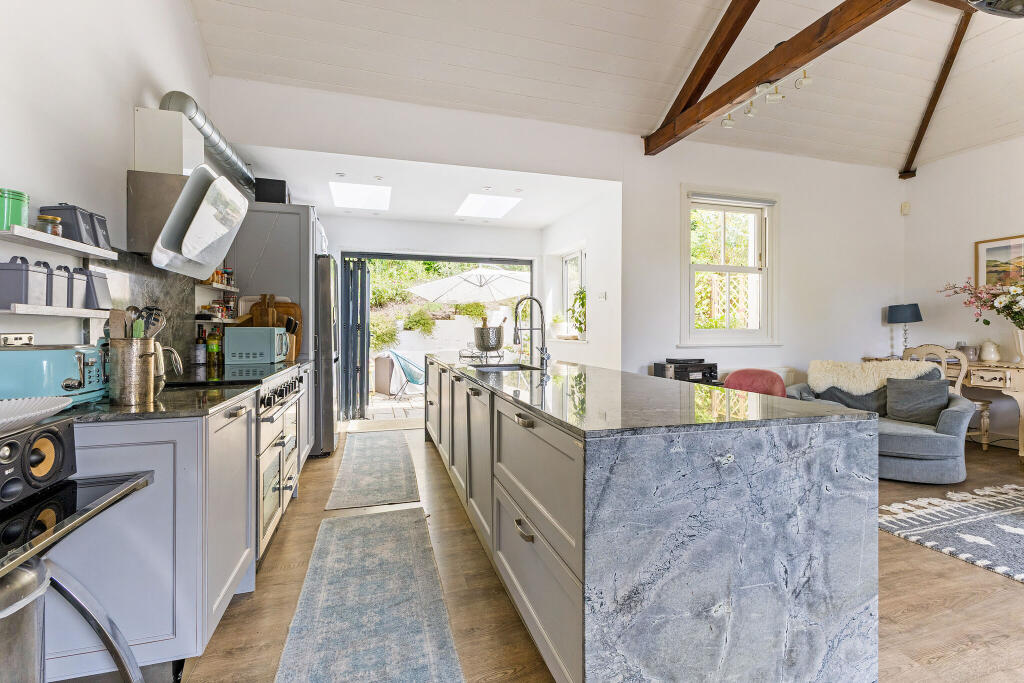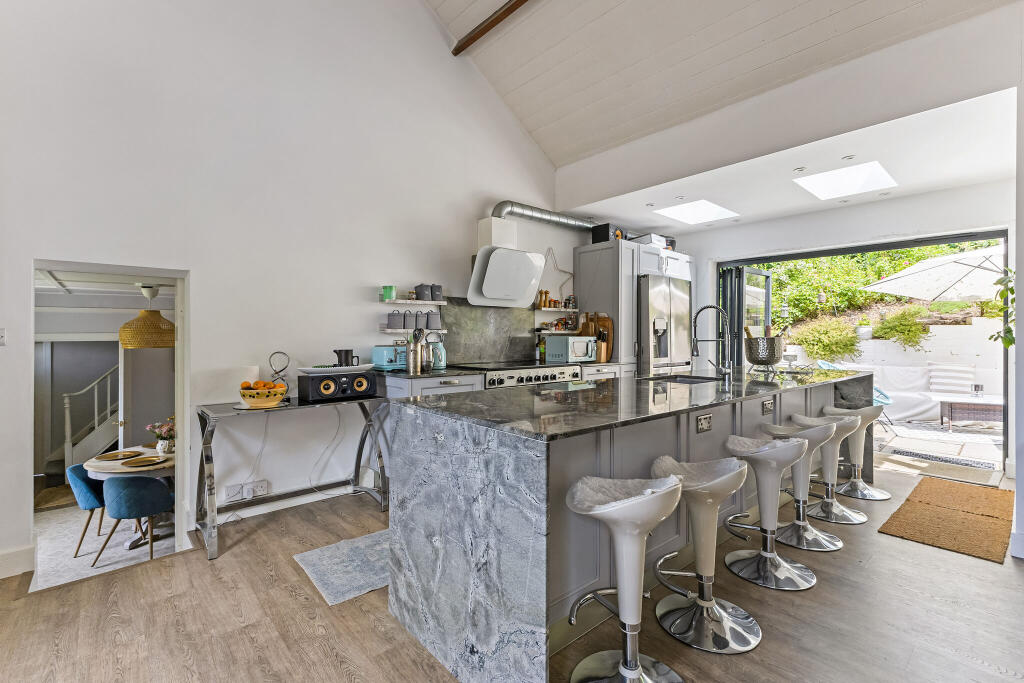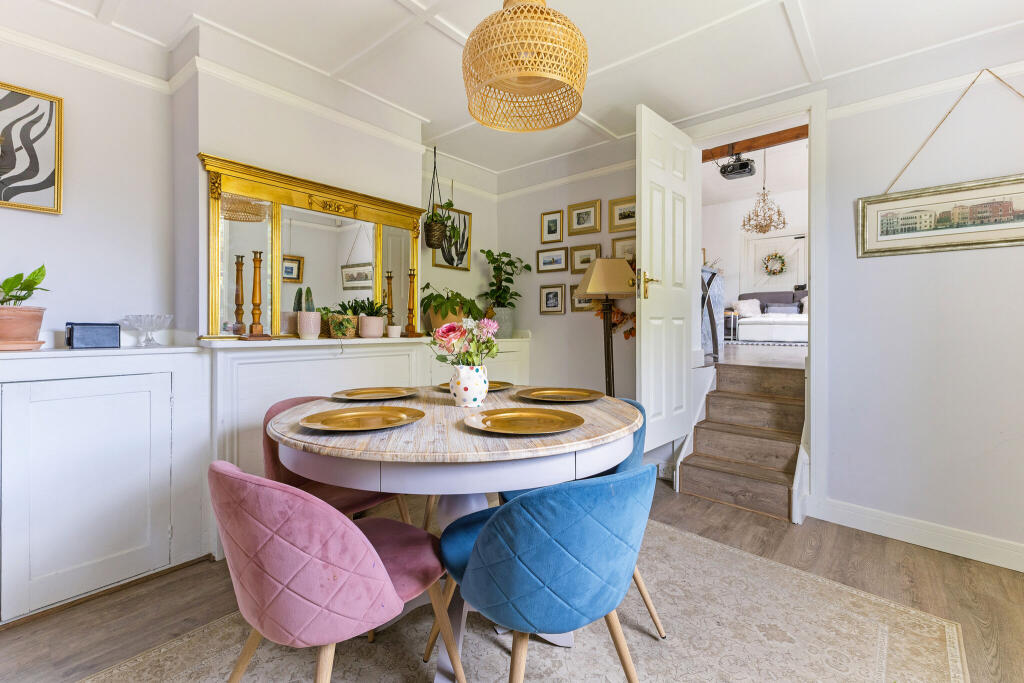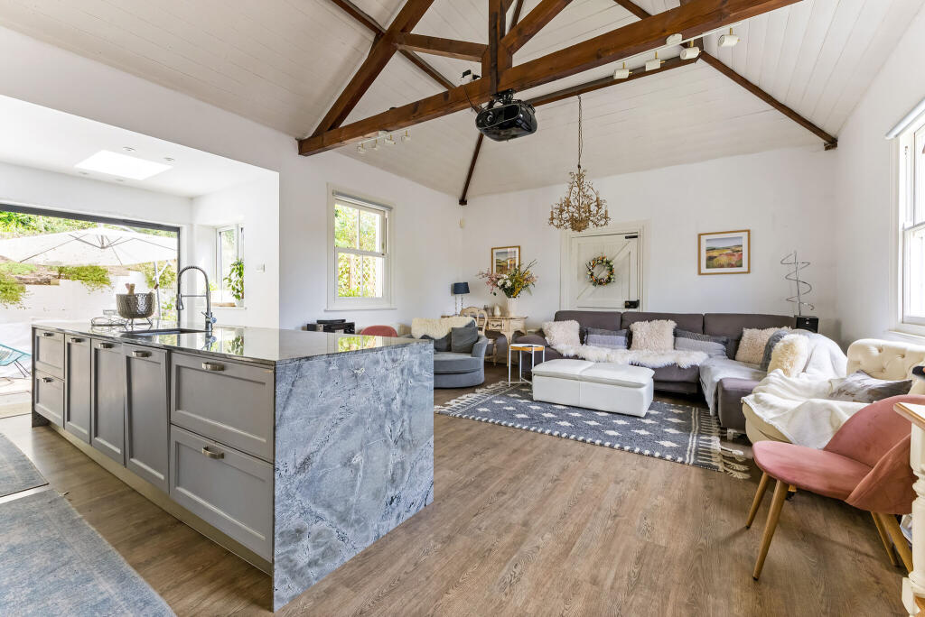 Dell Cottage is a charming Georgian home in Wooburn Green, beautifully updated while retaining period features like sash windows and fireplaces. A standout is the modern kitchen/family room with a vaulted ceiling and bi-fold doors opening to a secluded garden with rural views.