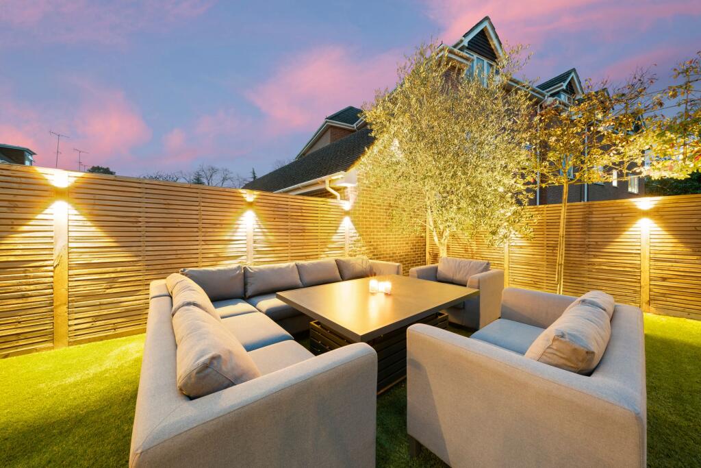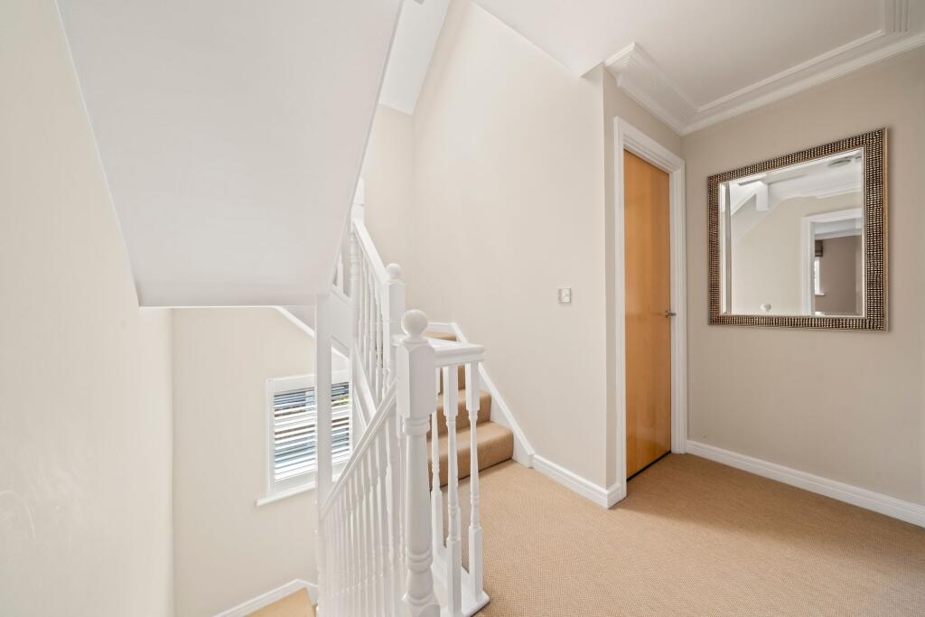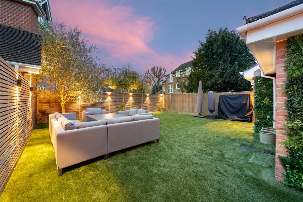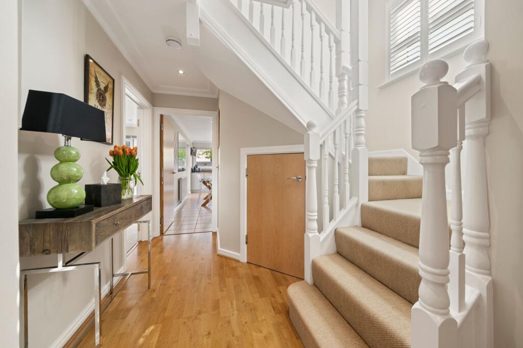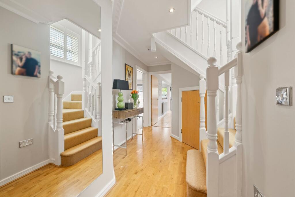 Attractive five bed family home in a private gated development, moments from Cobham Station & High Street. Expertly crafted interiors, luxury living, landscaped garden, gym, and ample parking