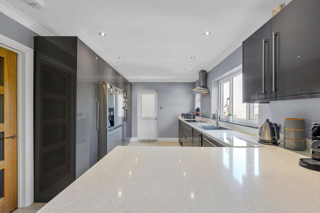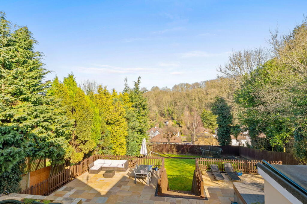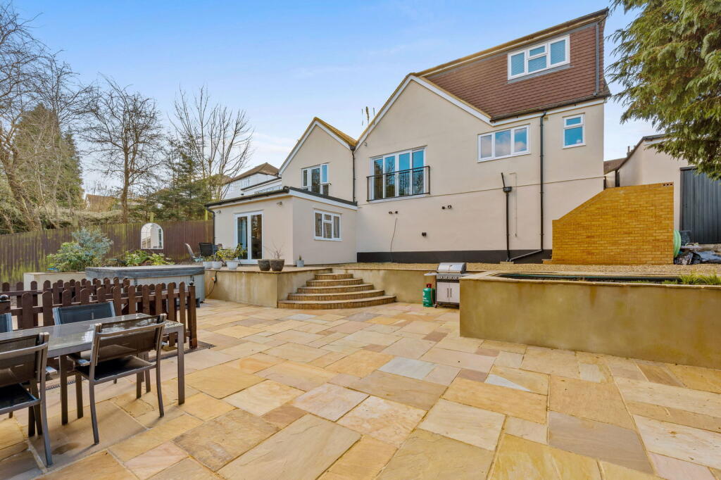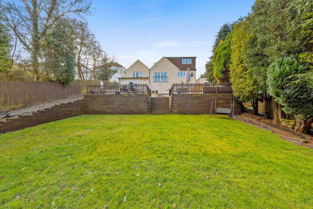 The property is located on Searchwood Road, Warlingham, Surrey, a suburb with good access to nearby towns and villages. The area benefits from relatively easy access to transport links via Upper Warlingham station, which is within walking distance according to the provided data, making commuting to London and other areas more convenient. The presence of several well-regarded schools within a reasonable distance further enhances the desirability of the location for families. The photos show a well-maintained garden, adding to the property’s appeal.