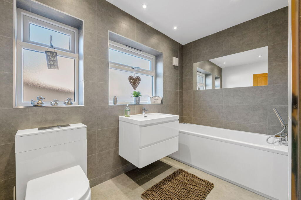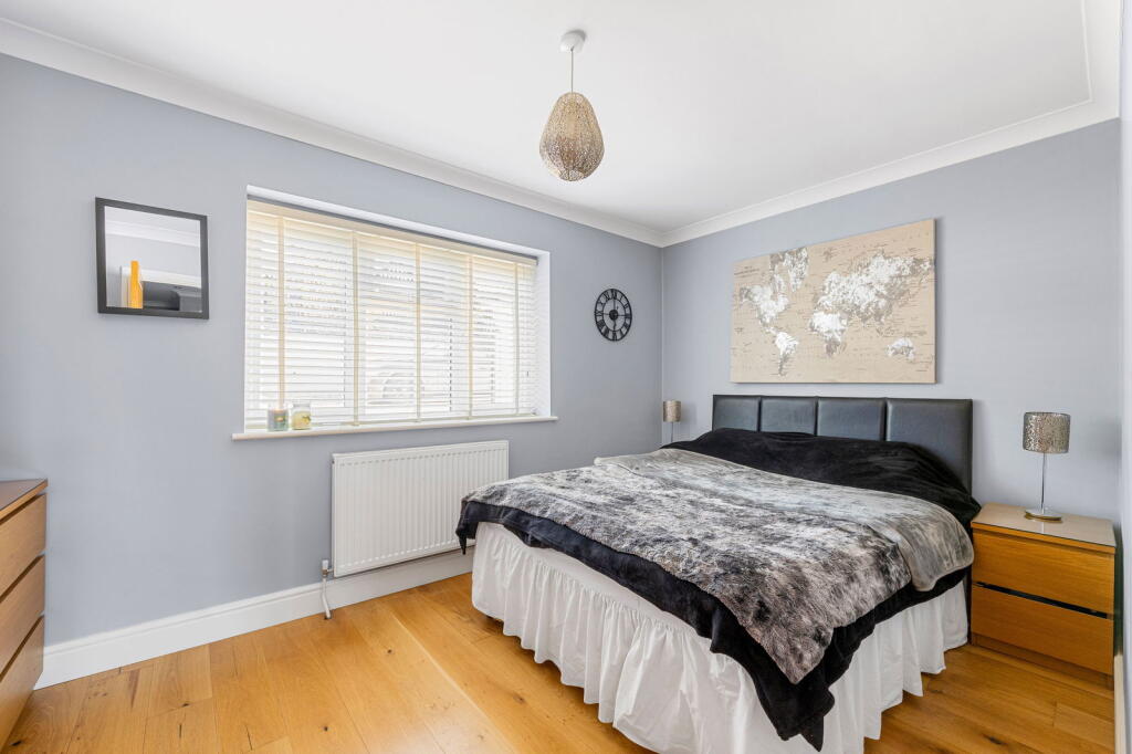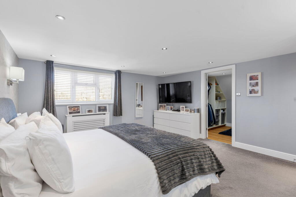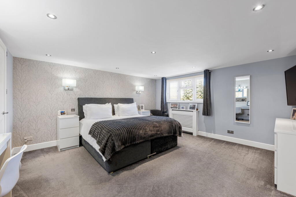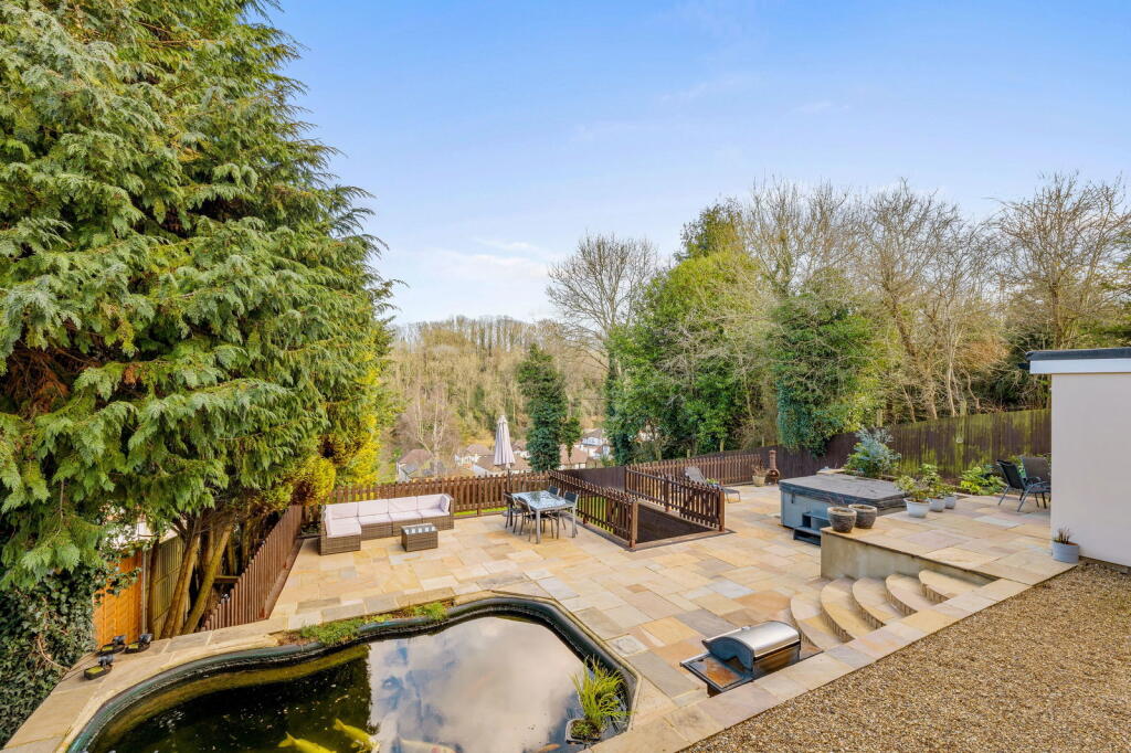 The property is located on Searchwood Road, Warlingham, Surrey, a suburb with good access to nearby towns and villages. The area benefits from relatively easy access to transport links via Upper Warlingham station, which is within walking distance according to the provided data, making commuting to London and other areas more convenient. The presence of several well-regarded schools within a reasonable distance further enhances the desirability of the location for families. The photos show a well-maintained garden, adding to the property’s appeal.