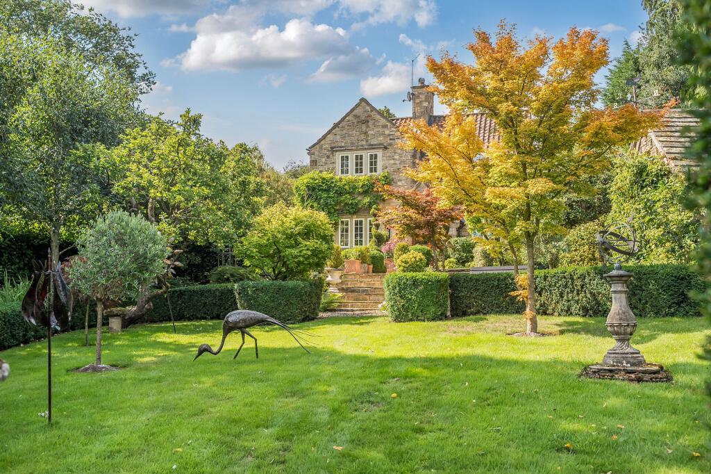 Stone-built residence on College Farm Lane behind electric gates. Exquisite charm, half-acre gardens with mature trees, conservatory, character-filled rooms. Double car port, close to amenities, sought-after location.