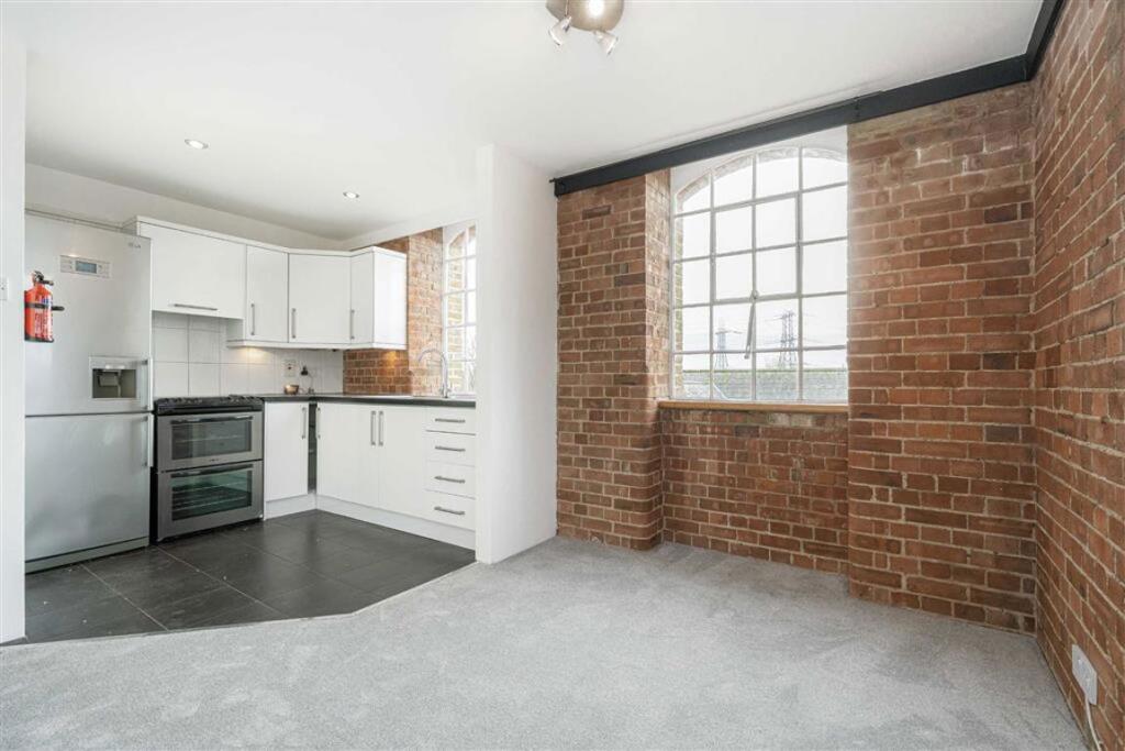 This is a two-bedroom flat located in Addlestone, Surrey. The property is situated in a converted mill, offering unique architectural features such as exposed brickwork and large windows. The flat includes a modern kitchen and bathroom, and a balcony with views. Residents have access to communal facilities including a swimming pool and gym. The location provides convenient access to local amenities, schools, and transportation links, including Addlestone railway station.