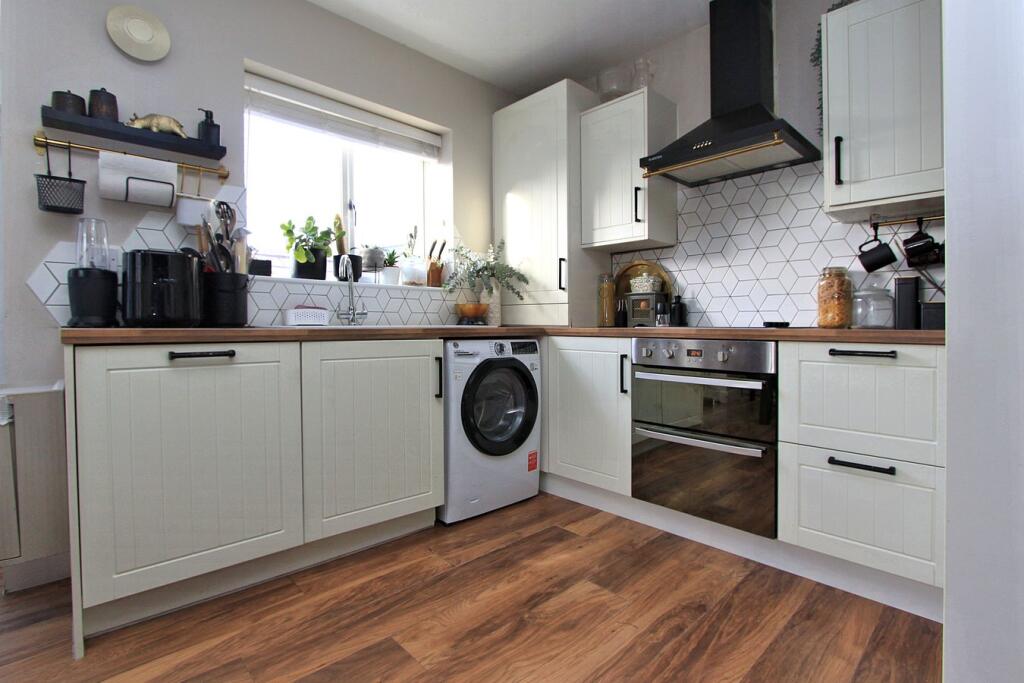 This is a semi-detached property located in Thornbury, South Gloucestershire. The house has three bedrooms and two bathrooms. The property appears to be in good condition, with a modern kitchen and well-maintained interior. It also benefits from a garden. The location is family-friendly, with schools nearby. The asking price seems reasonable compared to the average property price in the area.