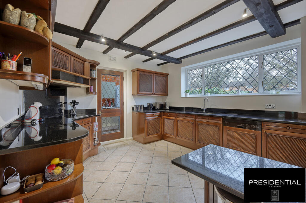 This four-bedroom, two-bathroom semi-detached property located on Wellfields in Loughton, Essex, presents a comfortable family home. The property benefits from a substantial garden, providing extensive outdoor space. The interior showcases a blend of modern and traditional features, such as the updated kitchen and the exposed ceiling beams in the living areas which provide character. The overall condition appears good, but some areas, such as the bathrooms, might benefit from modernisation.