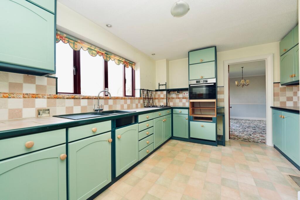 This property is a 4-bedroom, 2-bathroom detached house located in Kimbolton, Huntingdonshire. The location is desirable, with nearby highly-rated primary schools such as Kimbolton Primary Academy (rated Good by Ofsted) within close proximity. The property itself benefits from a double garage and a sizeable garden, adding to its appeal. However, the interior images reveal that the property is in need of modernisation. The kitchen and bathrooms are dated, and the carpets and wall coverings throughout appear tired. While the property offers a good amount of space and a desirable location, potential buyers should factor in the cost of renovations.