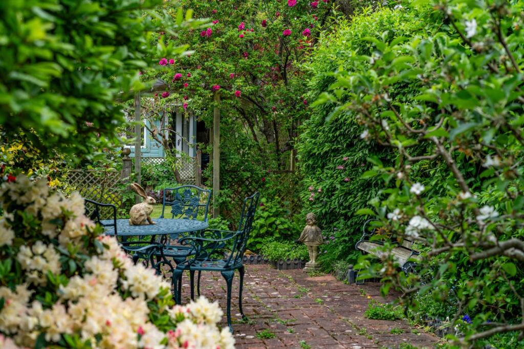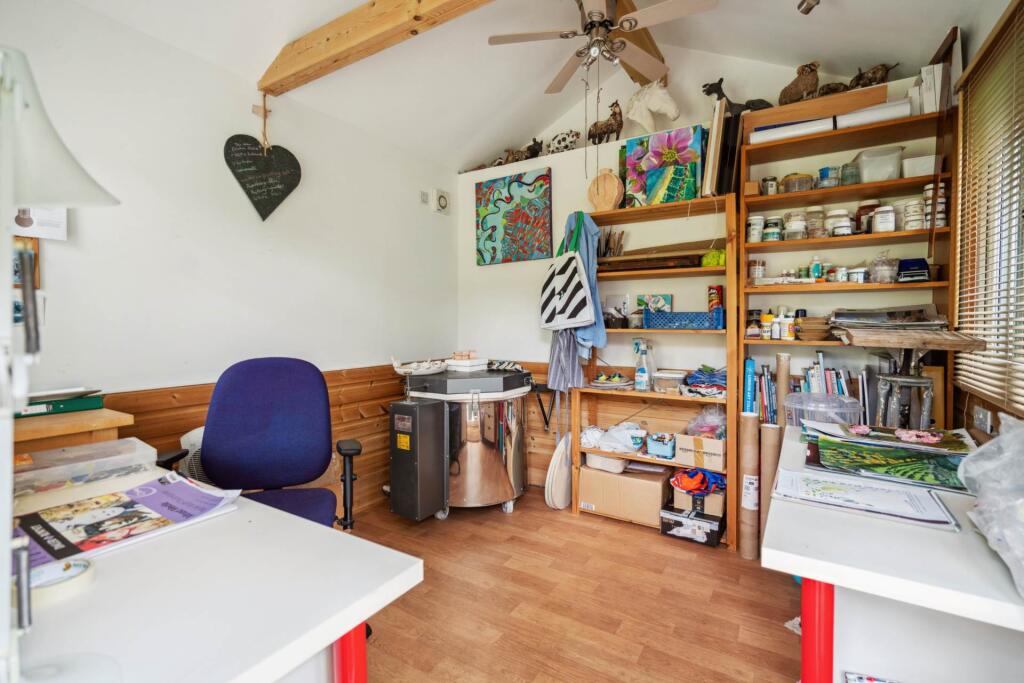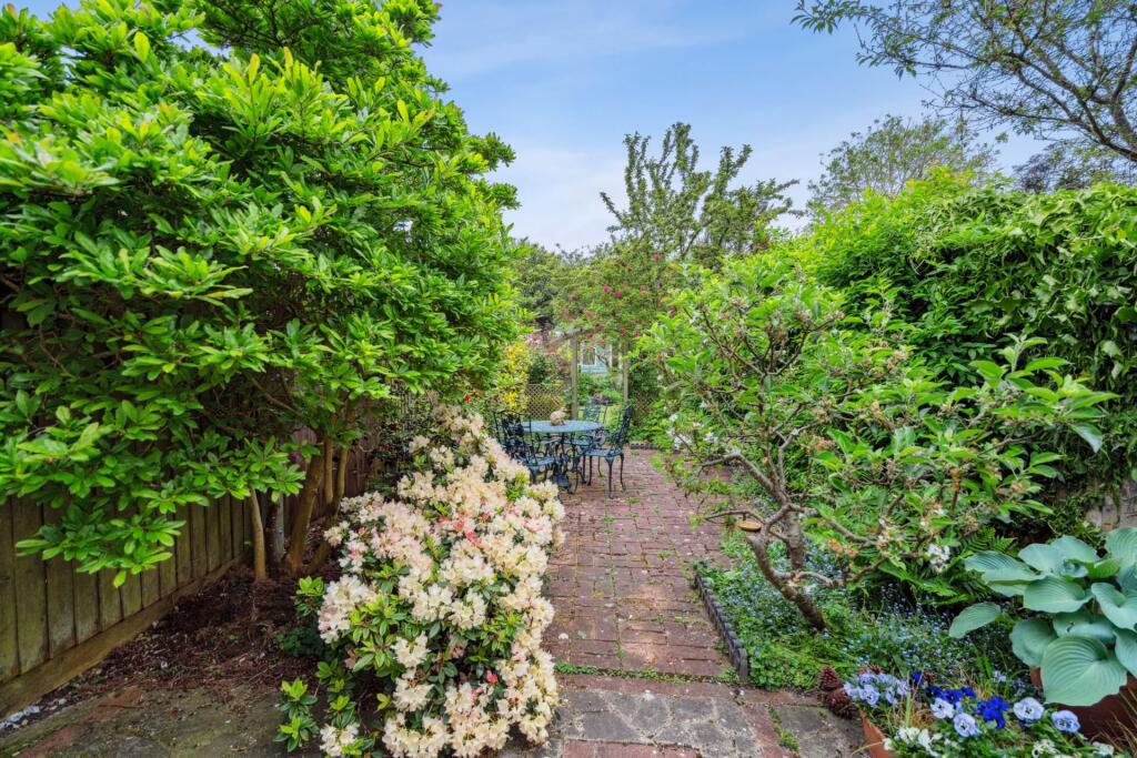 The property includes a sizeable garden, featuring mature plants and a patio area, providing a private outdoor space. The garden also includes a garden shed, which could be used as a workshop or storage space. The plot size of 956 sqft is a reasonable size for a property of this type in the area.
