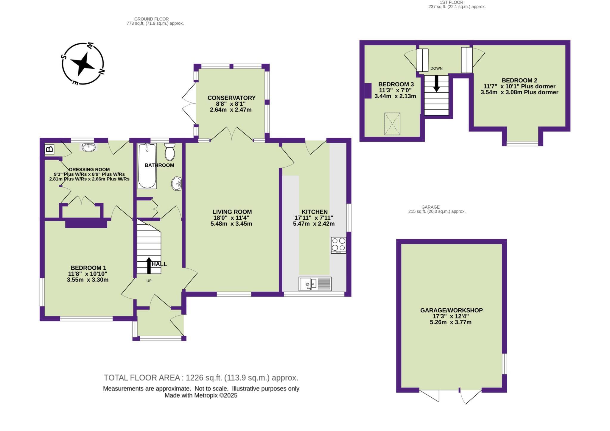 Well Presented Detached Chalet Style Home with Large Garage, Garden and Parking. Generous Ground Floor Bedroom with Dressing Room, Two Further (First Floor) Bedrooms, Ground Floor Bathroom, Living Room, Kitchen and Conservatory.