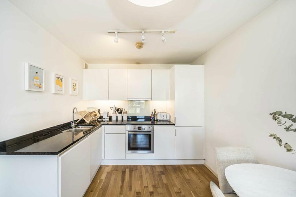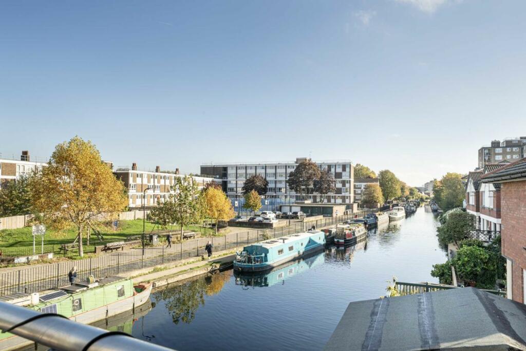 A one double bedroom first floor apartment with a private balcony on the regents canal. This property has an open plan living room and kitchen with space to dine. This property has hard flooring throughout, floor to ceiling windows and modern integrated appliances. It is offered chain free.