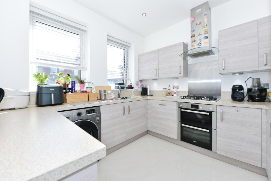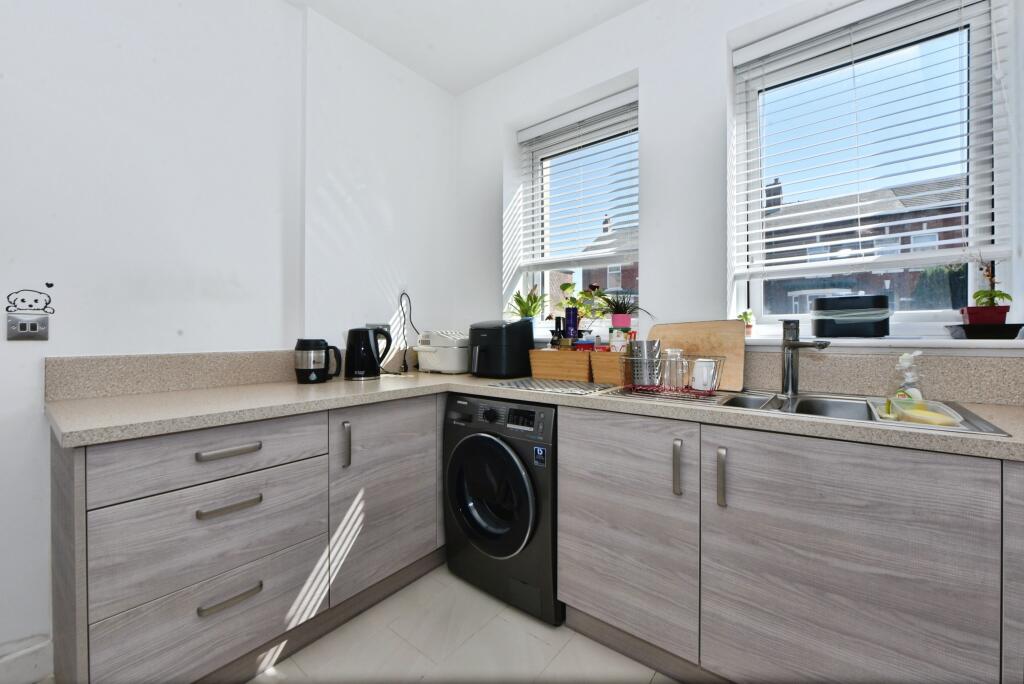 The property appears to be in excellent condition based on the provided images. The interior is modern and well-maintained, with a recently updated kitchen and bathrooms. There is evidence of a small, manageable garden to the rear of the property.